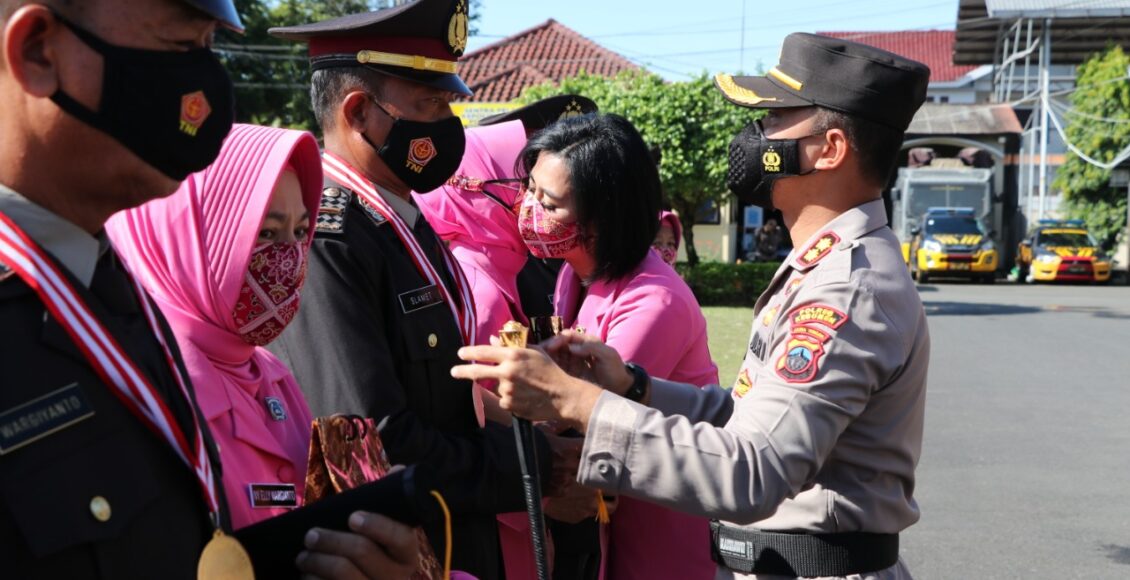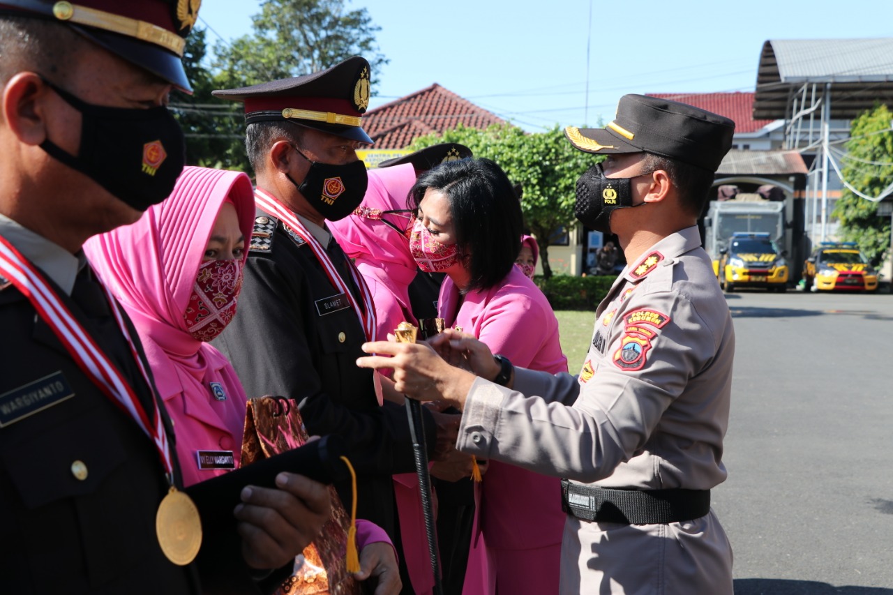 Sebelum dilepas, para personel yang mengakhiri masa baktinya diupcarakan terlebih dahulu, lalu secara simbolis Kapolres menyerahkan tanda penghargaan berupa pengalungan medali dan pemberian piagam penghargaan.