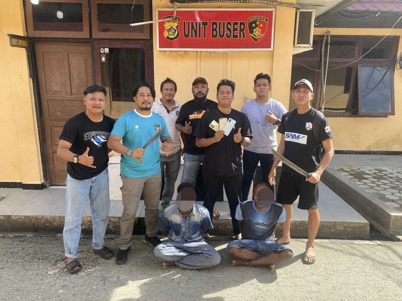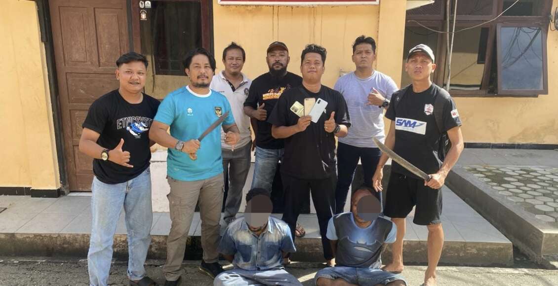 “Berdasarkan dari laporan polisi yang dibuat korban kami melakukan penyelidikan dan berhasil mengidentifikasi para pelaku, keduanya berhasil kami tangkap saat sedang duduk bermain Handphone di depan salah satu kios yang ada di Doyo Baru, setelah melakukan penangkapan tim kemudian mengembangkan dengan berhasil menyita barang bukti 6 unit handphone, dompet dan surat – surat berharga korban, 1 speaker, dan 2 buah parang yang dipakai para pelaku saat melancarkan aksinya,” ungkapnya.
