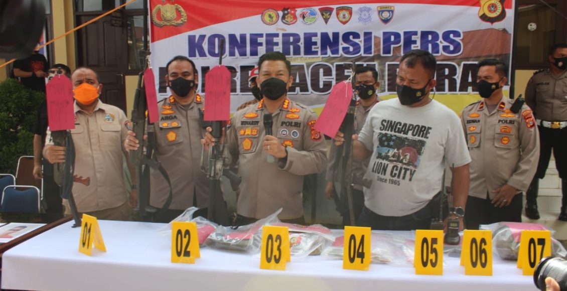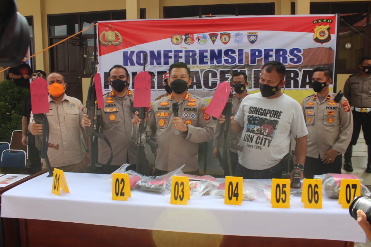 Aceh Barat,ikagawanews.id – Kabid Humas Polda Aceh Kombes Pol Winardy, S.H., S.I.K., M.Si. dalam konferensi persnya menjelaskan, kasus penembakan Pos Pol Panton Reu Polres Aceh Barat telah diungkap secara tuntas oleh tim gabungan dari Polres Aceh Barat, Polda Aceh, dan Densus 88 Satgaswil Aceh, Sabtu (27/11/2021) di Mapolres Aceh Barat.