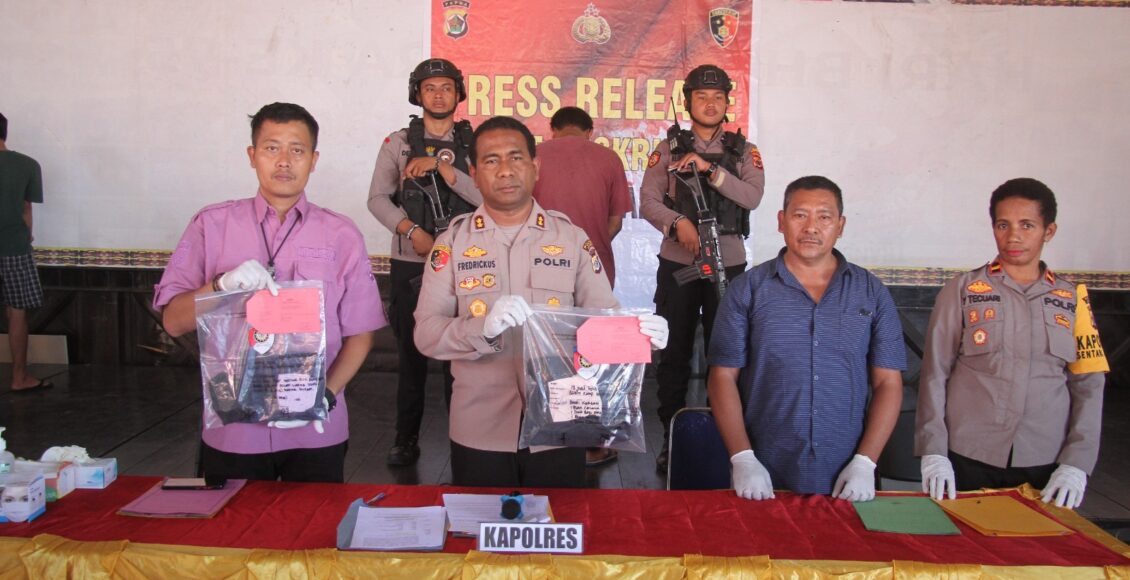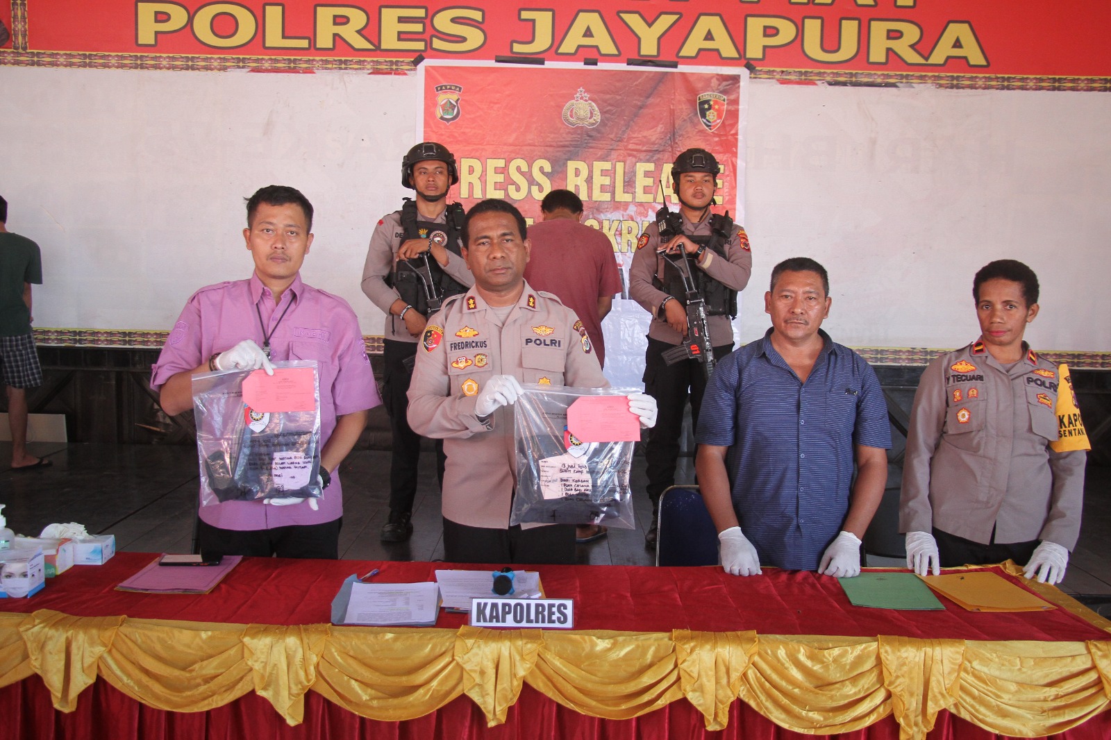 Disampaikan langsung Kapolres Jayapura AKBP Fredrickus W.A Maclarimboen, S.IK., MH yang didampingi Kasat Reskrim AKP Sugarda A.B Trenggono, S.TK., MH dengan mengahadirkan pelaku berinisial berinisial BG (26) berikut barang bukti dari kedua korbannya.
