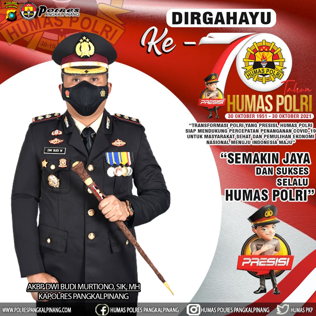 Terkait hal itu, pagi tadi Kapolres Pangkalpinang AKBP Dwi Budi Murtiono, S.IK M.H mengucapkan selamat hari ulang tahun ke 70 Humas Polri tahun 2021. Semoga Humas Polri mampu menjadi sumber informasi yang cepat, mudah diakses objektif, terpercaya serta selalu partisipasi dalam setiap momentum. Guna mendukung kamtibmas yang aman dan kondusif.
