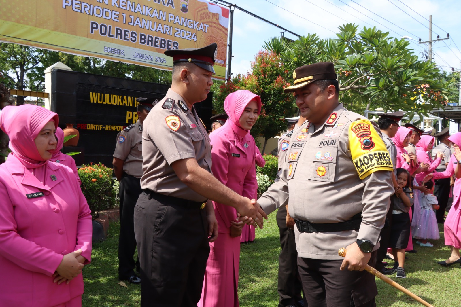 Prosesi tersebut dilaksanakan dalam sebuah upacara Corp Rapot dan Laporan Kenaikan pangkat TMT 1 Januari 2014 yang digelar dihalaman Mapolres Brebes, Minggu (31/12/2023) 2023 yang dipimpin langsung oleh Kapolres Brebes AKBP Guntur Muhammad Tariq SIK.