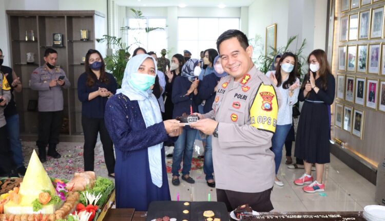 Kapolres Gresik AKBP Mochamad Nur Azis di dampingi ibu Lina Azis menerima kue tart dan ucapan selamat ulang tahun.