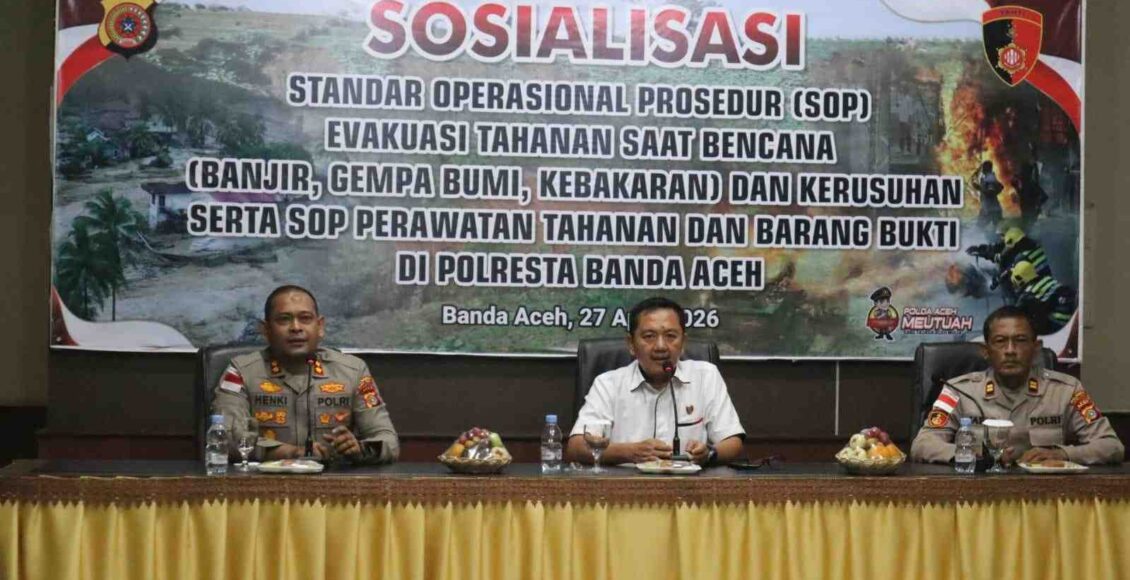 BANDA ACEH,ikagawanews.id – Polresta Banda Aceh melalui Satuan Tahanan dan Barang Bukti (Sat Tahti) melaksanakan kegiatan sosialisasi Standar Operasional Prosedur (SOP) evakuasi tahanan dalam situasi bencana yang dirangkaikan dengan supervisi dari Direktorat Tahanan dan Barang Bukti (Dit Tahti) Polda Aceh yang dipimpin langsung oleh Plh Dirtahti AKBP Taufik Rahman. Kegiatan ini berlangsung di Aula Machdum Sakti dengan tujuan meningkatkan kesiapsiagaan personel dalam menghadapi kondisi darurat, Senin (27/4/2026).