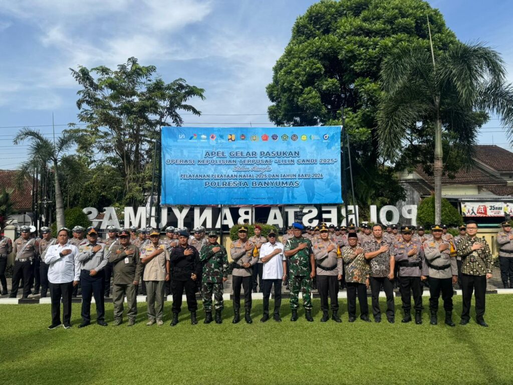BANYUMAS,ikagawanews.id – Polresta Banyumas menggelar Apel Gelar Pasukan Operasi Lilin Candi 2025 di halaman Mapolresta Banyumas, Jumat (19/12/2025) pagi. Apel tersebut sebagai wujud dari kesiapan seluruh unsur pengamanan dalam rangka pengamanan perayaan Natal 2025 dan Tahun Baru 2026 di wilayah Kabupaten Banyumas.