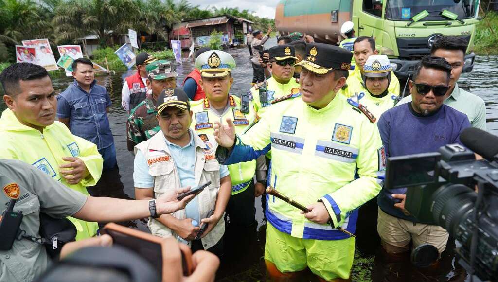 Kapolda Riau Irjen Pol Muhammad Iqbal yang didampingi Dirlantas Polda Riau,Kapolres Pelalawan AKBP Suwinto dan Bupati Pelalawan H. Zukri, wakil Bupati Pelalawan H. Nazaruddin, Ketua DPRD Kabupaten Pelalawan Baharuddin dan sejumlah Forkopimda Pelalawan, yang turut hadir saat Kapolda turun mengecek kondisi banjir dan arus lalu lintas di jalan Lintas Timur yang terendam banjir.