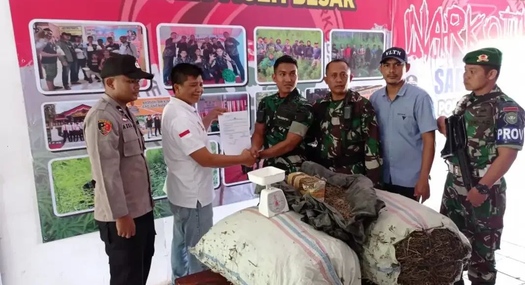 JANTHO,ikagawanews.id – Plh Pasi Intel Batalyon 117/KY Jantho, Letda Fikri Frimahesa Nurbani STr, bersama sejumlah prajurit Batalyon itu, menyerahkan barang temuan 70 kilogram ganja kering ke Satuan Narkoba Polres Aceh Besar, Sabtu (28/5/2022).