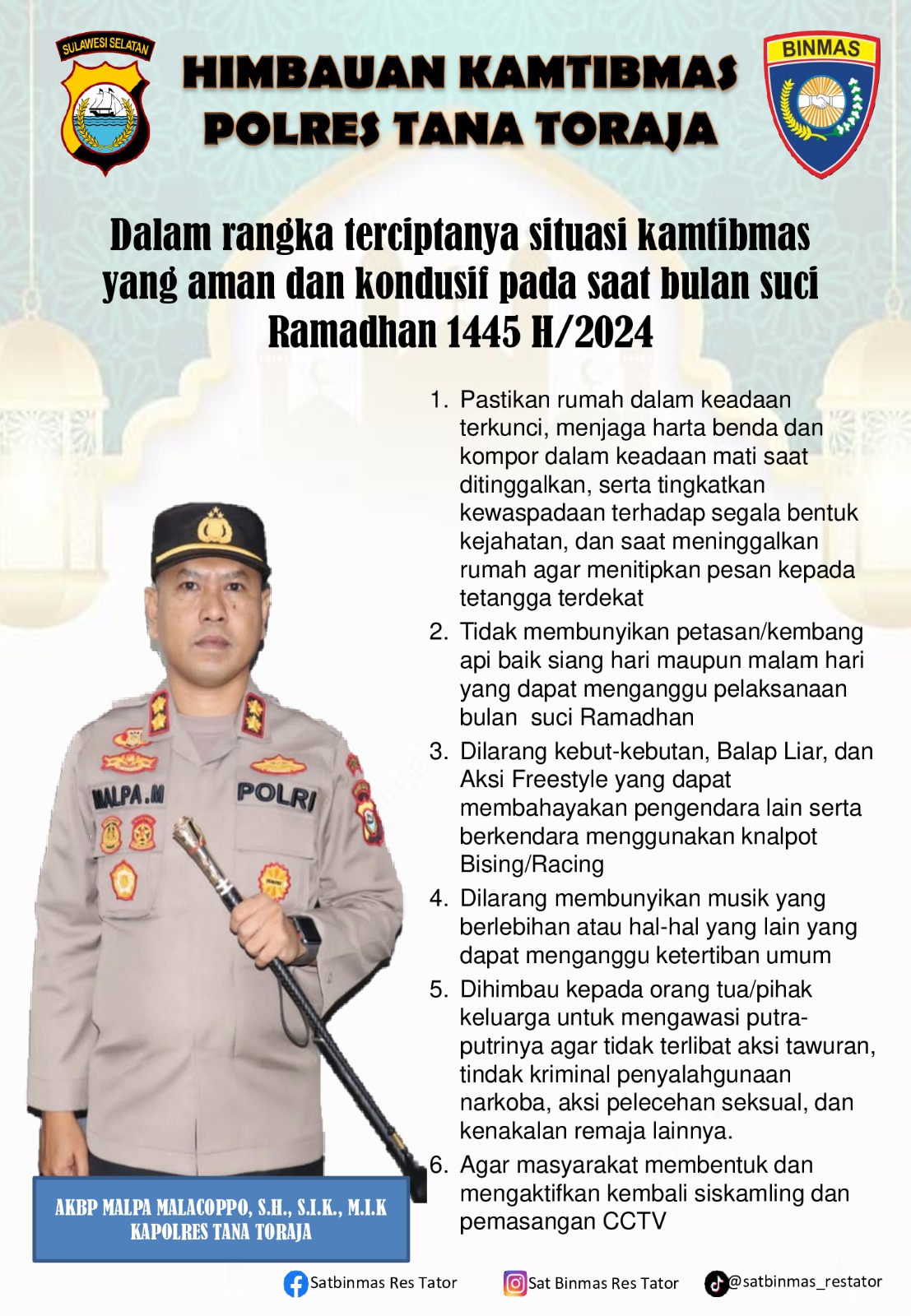 Menurut Kapolres Tana Toraja AKBP Malpa Malacoppo, bahwa menjelang perayaan hari raya Idul Fitri, aktivitas masyarakat akan meningkat, tentunya berbagai ancaman Kamtibmas bisa terjadi, guna menciptakan agar situasi tetap kondusif, ia memerintahkan seluruh jajaran untuk melaksanakan langkah – langkah pencegahan seperti meningkatkan Patroli, memberikan himbauan kepada masyarakat agar tetap waspada, utamanya yang berada pada area obyek wisata, pusat perbelanjaan dan pada tempat umum