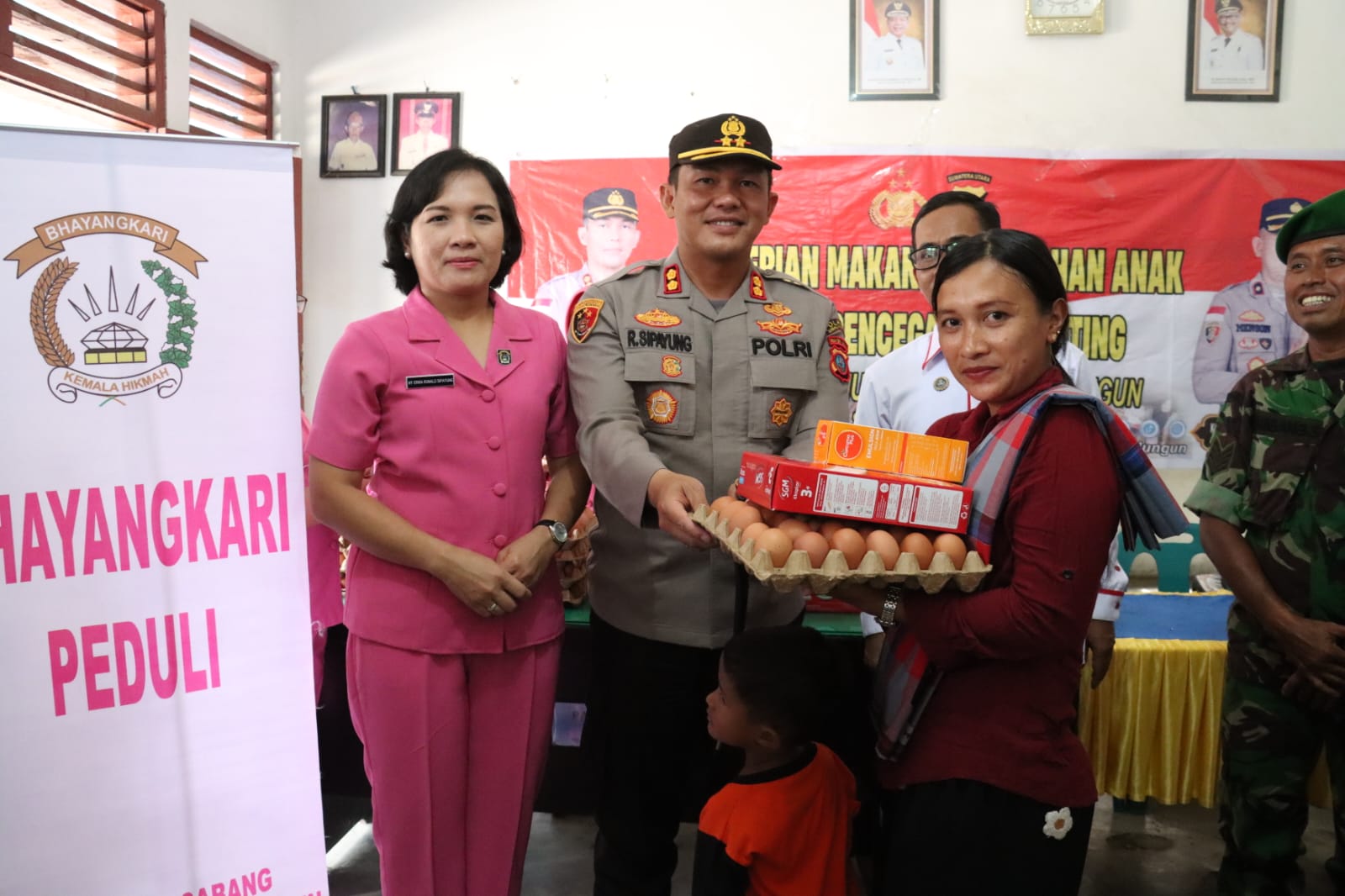 Pemberian Makanan Anak Untuk Pencegahan Stunting atau PMT(Pemberian Makan Tambahan) Stunting Tahap-III Kepada 110(Seratus sepuluh) Anak Asuh Polres Simalungun yang berada di 18(delapan belas) Nagori Se-Kabupaten Simalungun dilaksanakan secara langsung oleh Kapolres bersama Ketua Bhayangkari Cabang Simalungun di 2(dua) Nagori.