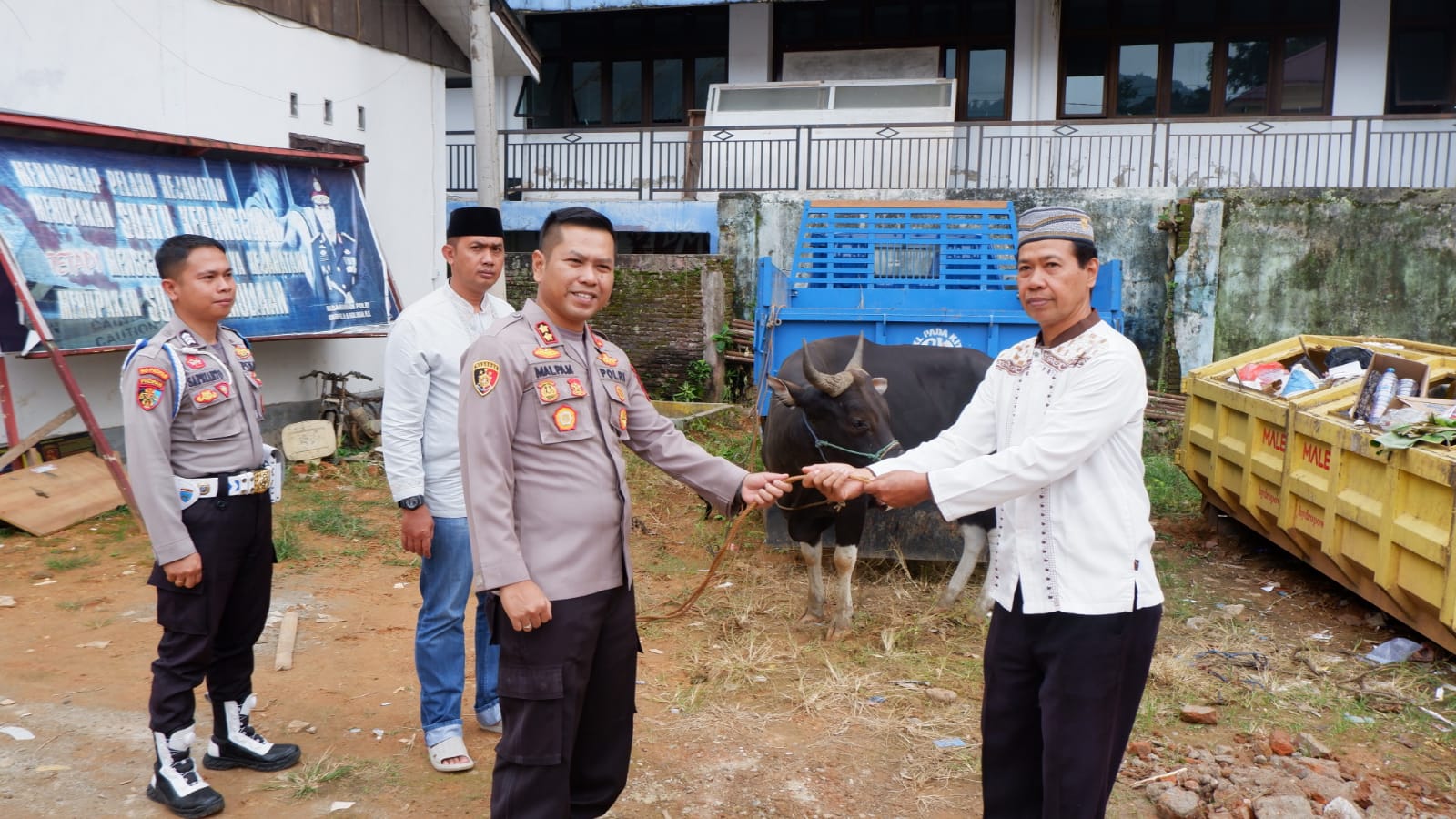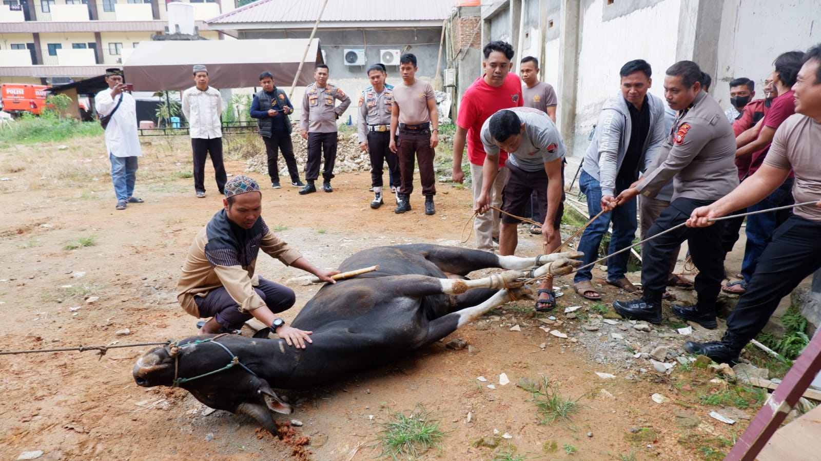 Kapolres menyerahkan secara simbolis sapi Qurban kepada panitia Qurban dan dilanjutkan dengan pemotongan hewan Qurban jenis sapi sebanyak 3 ekor, selanjutnya disembeli dan dagingnya dibagikan kepada warga yang membutuhkan.