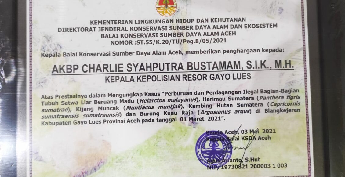 Kasat Reskrim Polres Gayo Lues Iptu Irwansyah, S.E. beserta 3 orang penyidiknya Bripka Didik Darmadi jabatan sebagai Kanit II Satreskrim, Briptu Ahlun Nazar jabatan Banit II satreskrim dan Bripda Roby Cahyadi Syahputra jabatan Banit II Satreskrim, juga diberikan piagam penghargaan dari BKSDA Aceh atas prestasi mereka dalam pengungkapan kasus perburuan dan perdagangan illegal bagian-bagian tubuh satwa liar diwilayah hukum Polres Gayo Lues,dikutip dari , BARANEWSACEH.CO.