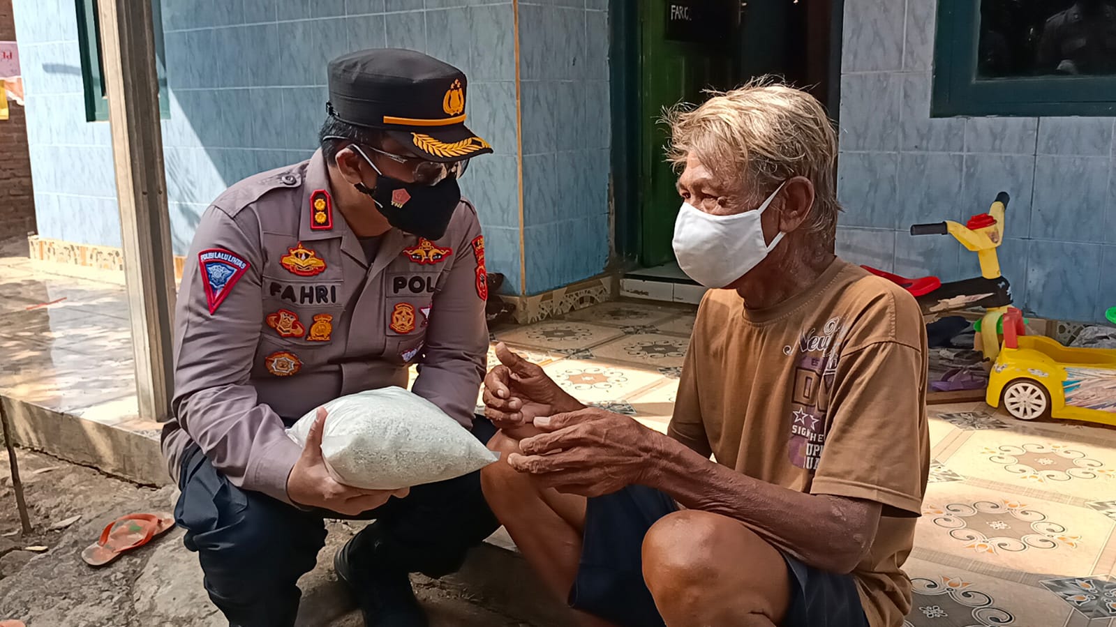Berjalan kaki, Kapolres Cirebon Kota Blusukan Bagikan Beras Kepada Warga Ditengah Pandemo Covid-19