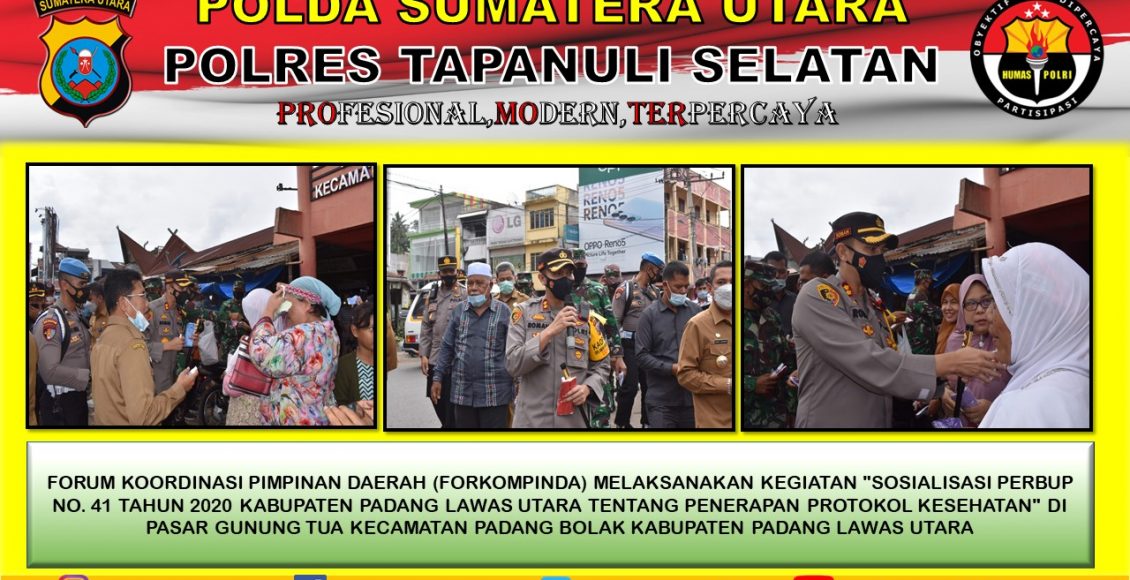 Untuk diketahui, sekitar pukul 13.30 Wib, Forum Koordinasi Pimpinan Daerah (Forkompinda) Kabupaten Padang Lawas Utara melaksanakan kegiatan sosialisasi Protokol Kesehatan dan Membagikan Alat Pelindung Diri (APD) berupa Masker dan Hansinitizer kepada masyarakat yang berada di Pasar Gunung Tua Kec. Padang Bolak Kab. Padang Lawas Utara.