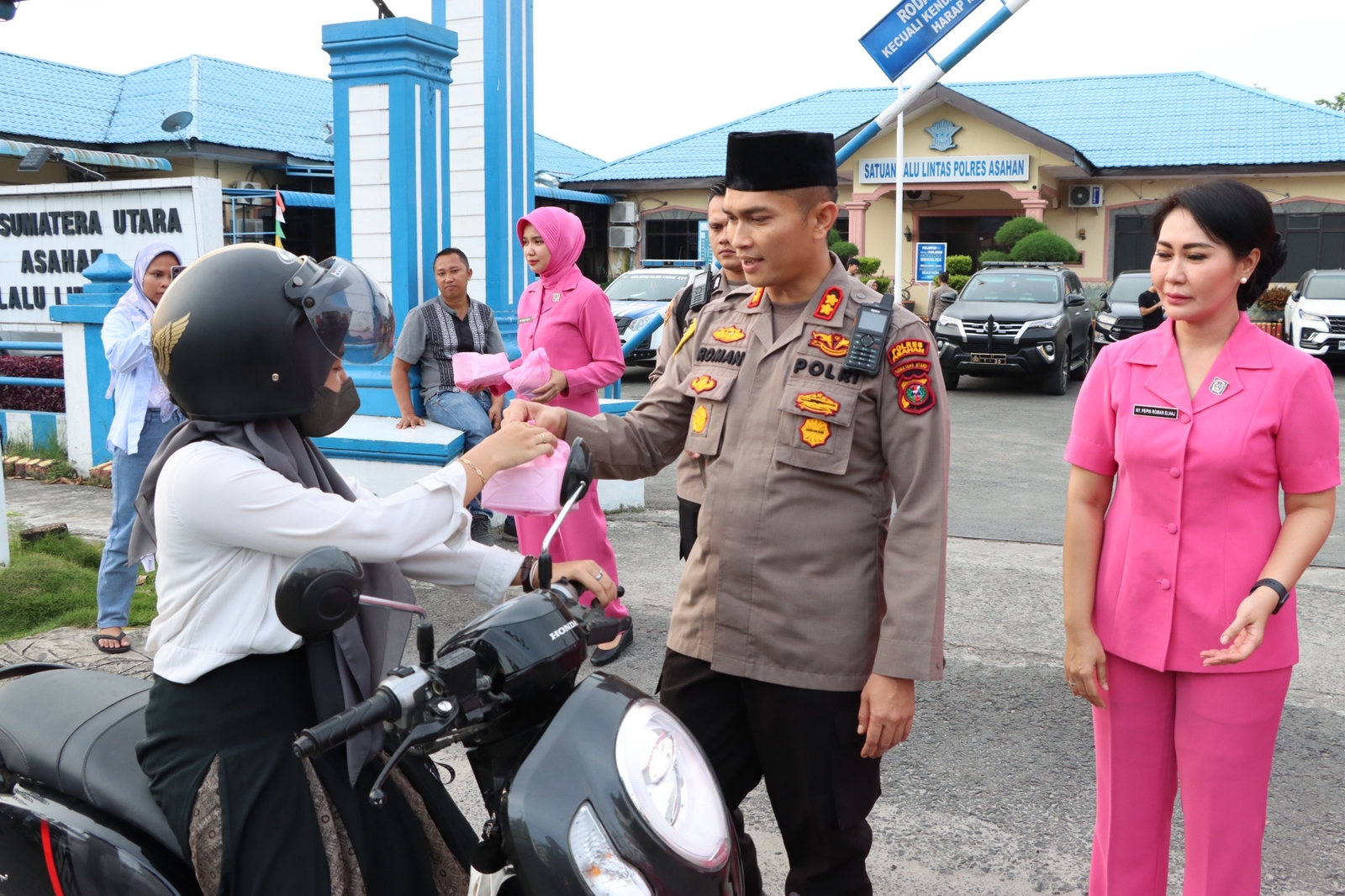 Tampak juga Kasat Lantas Polres Asahan AKP Galih Hariomursyid dan para ibu-ibu Pengurus Bhayangkari Cabang Asahan beserta Personel Satlantas Polres Asahan turut membagikan Takjil.