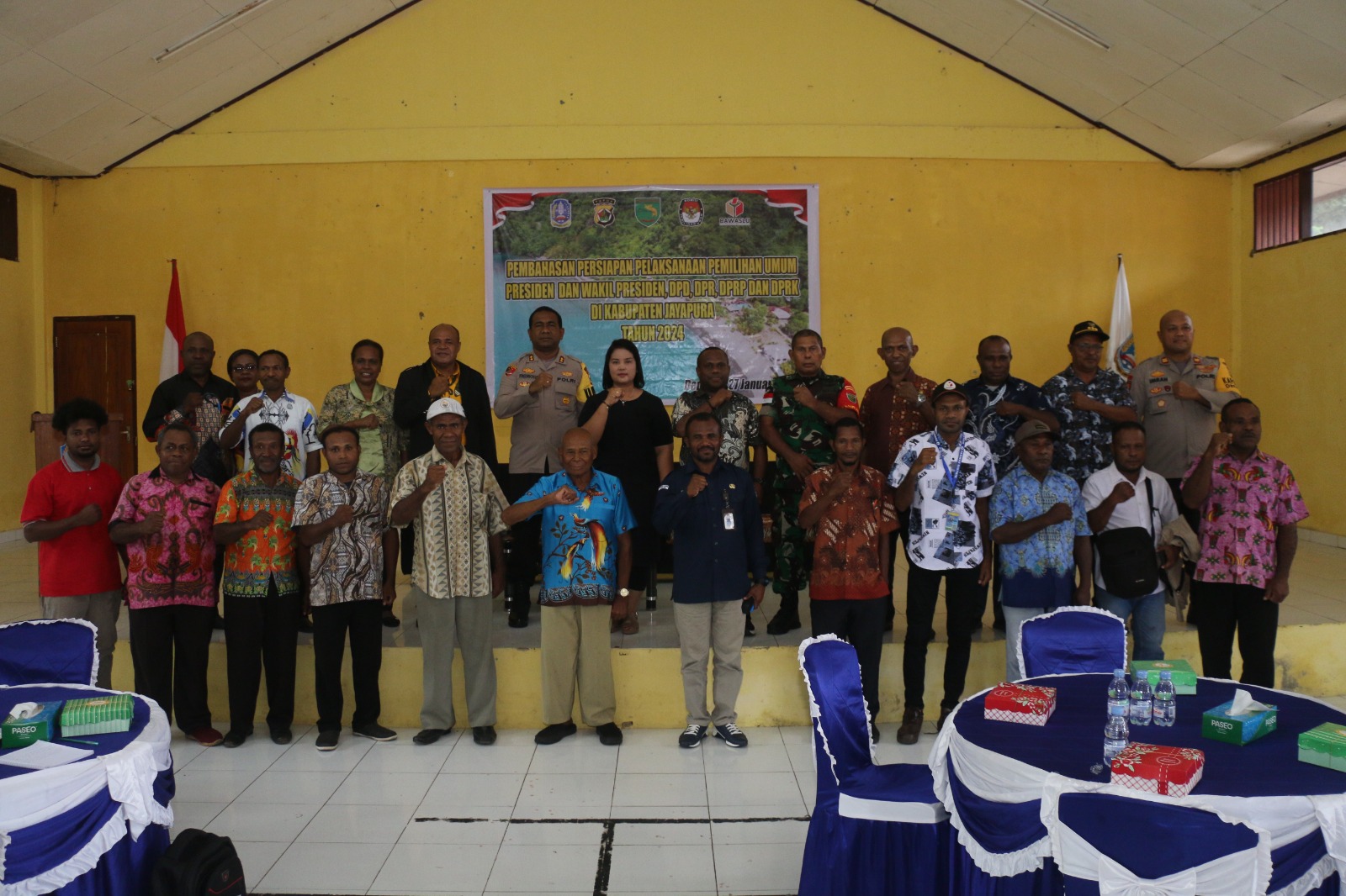 Dihadiri langsung Kapolres Jayapura AKBP Fredrickus W.A Maclarimboen, S.IK., MH, Pj. Bupati Jayapura yang diwakili Asisten I Sekda Kab. Jayapura Bidang Pemerintahan Dr. Elpina Situmorang, S.Sos., MKP, Ketua KPU Kab. Jayapura Daniel Mebri, serta mengundang Kadistrik Depapre, Raveni Rara, Yokari, Demta, dan Kadistrik Sentani Barat, para kepala Kampung, KPPS, PPD, panitia distrik, serta para tokoh adat guna membahas kesiapan pemilu yang akan berlangsung 14 Februari mendatang.