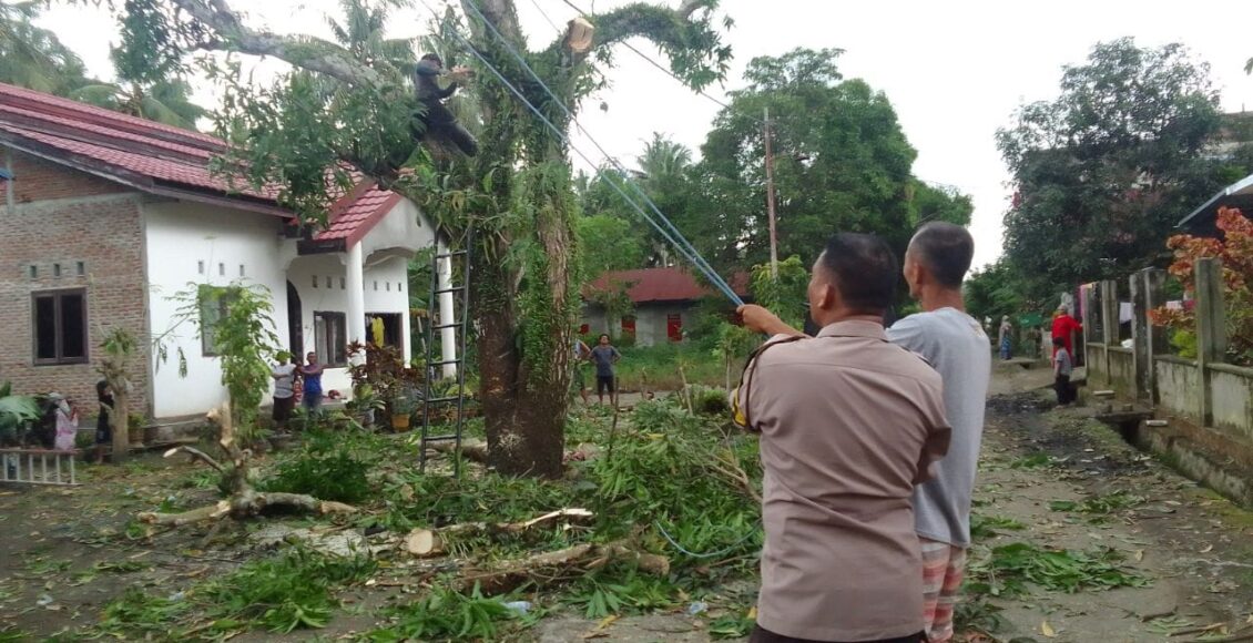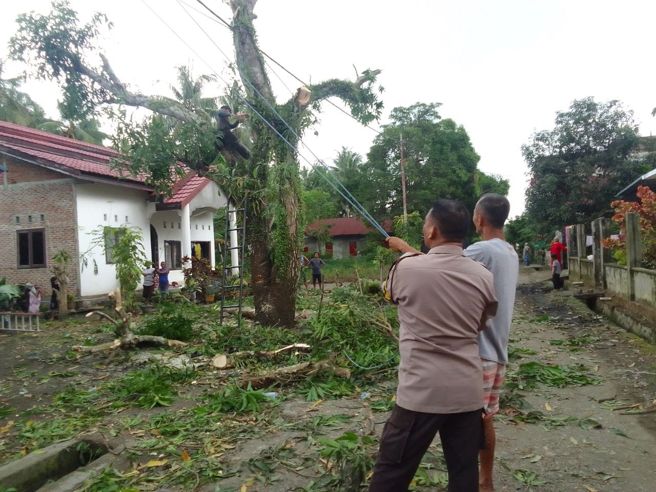 Bhabinkamtibmas dan Warga Bersama-Sama Tebang Pohon Yang Membahayakan