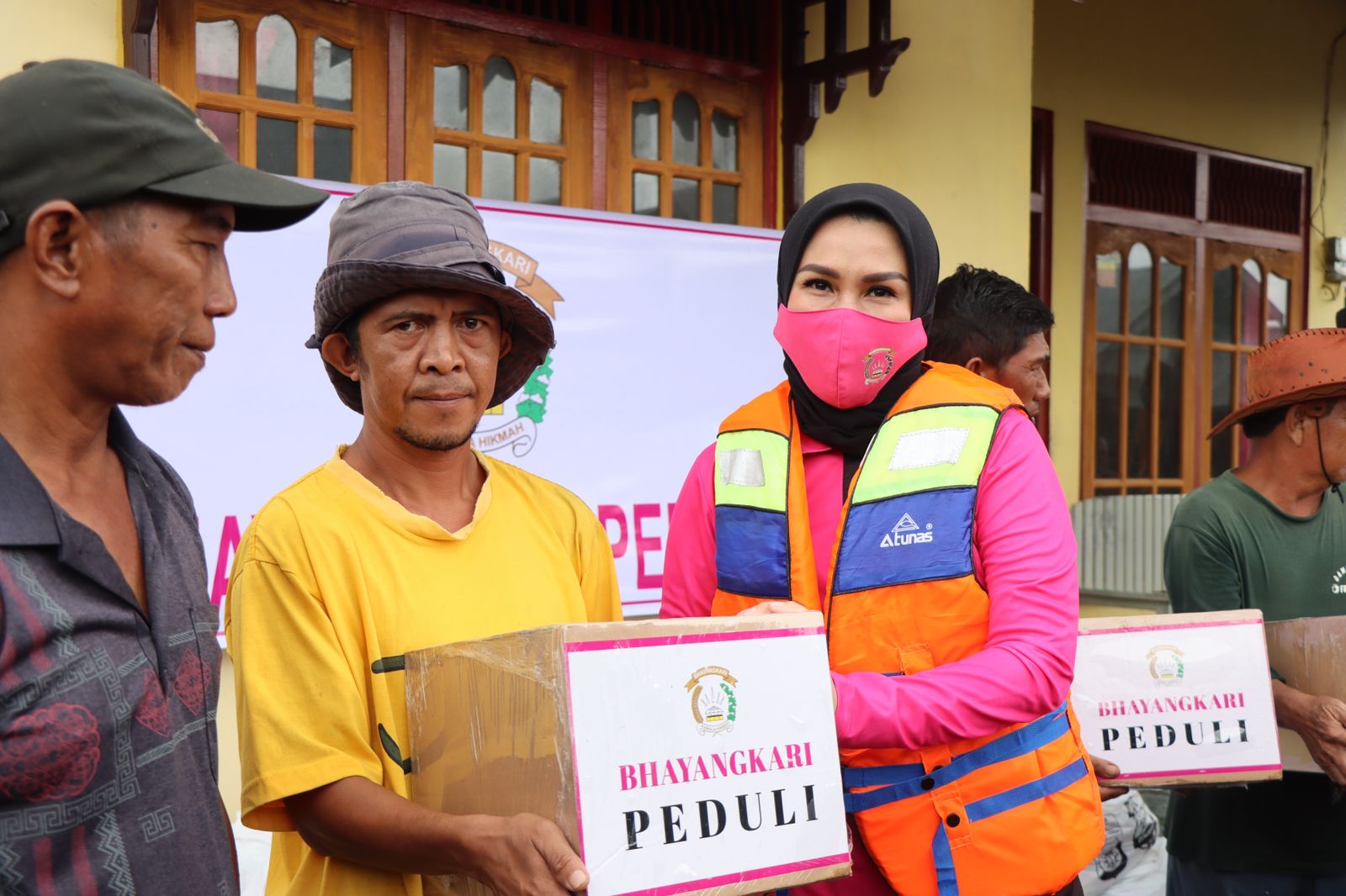Ketua Bhayangkari Cabang Kotawaringin Barat Ny. Wina Bayu Wicaksono mendampingi Wakapolda Kalimantan Tengah IRJEN Pol Ida Oetari Poernamasasi,SAP.,MA salurkan bansos untuk masyarakat yang terdampak banjir.(Foto:Humas)