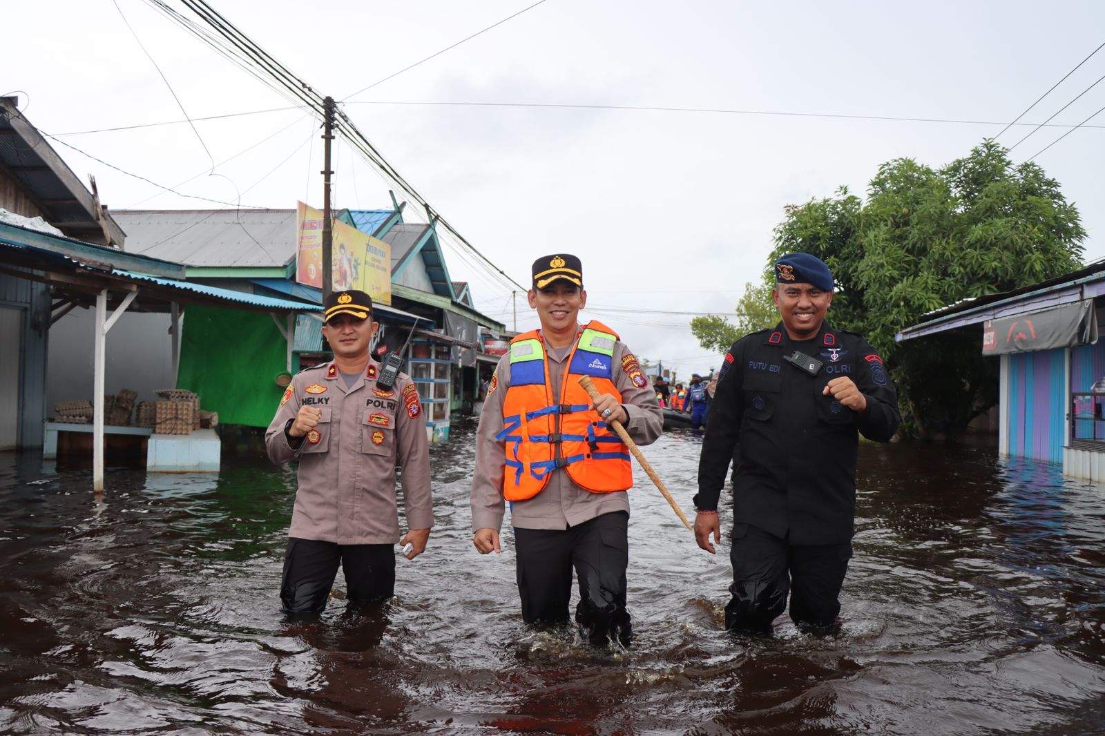 Kapolres Kotawaringin Barat AKBP Bayu Wicaksono,SH.,SIK.,M.Si cek langsung lokasi banjir saat dampingi Wakapolda Kalimantan Tengah IRJEN Pol Ida Oetari Poernamasasi,SAP.,MA.(Foto:Humas)