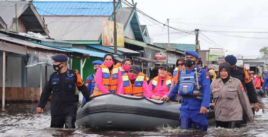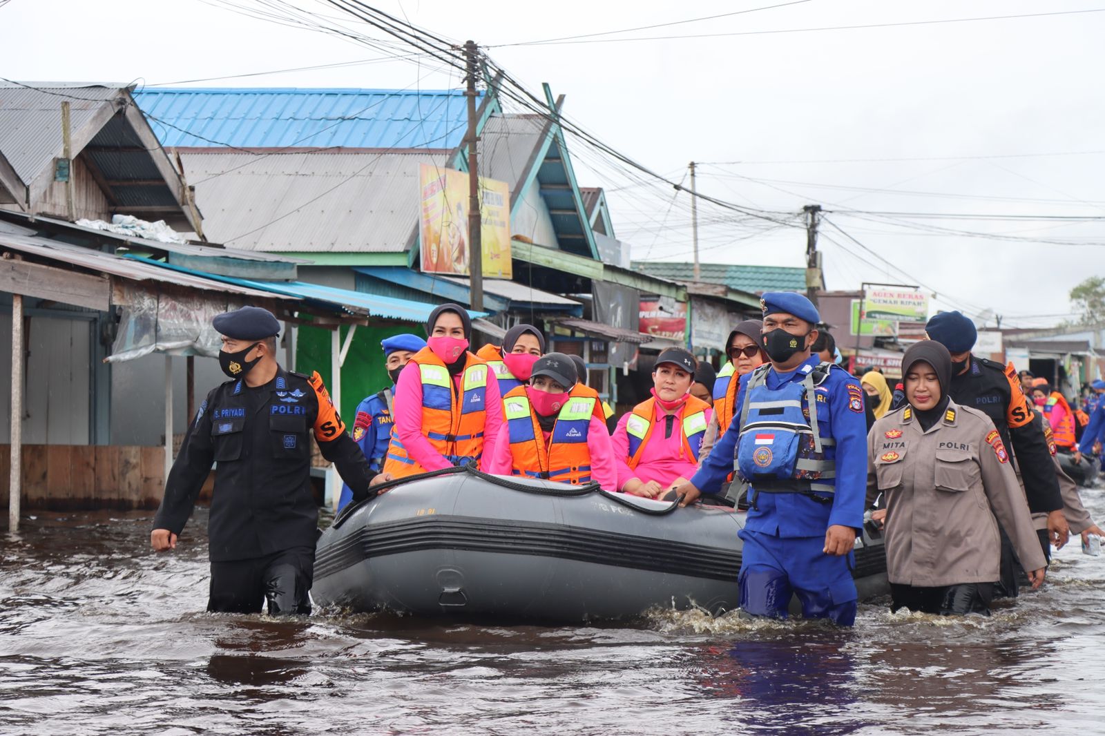 Kapolres Kotawaringin Barat AKBP Bayu Wicaksono,SH.,SIK.,M.Si cek langsung lokasi banjir saat dampingi Wakapolda Kalimantan Tengah IRJEN Pol Ida Oetari Poernamasasi,SAP.,MA.(Foto:Humas)