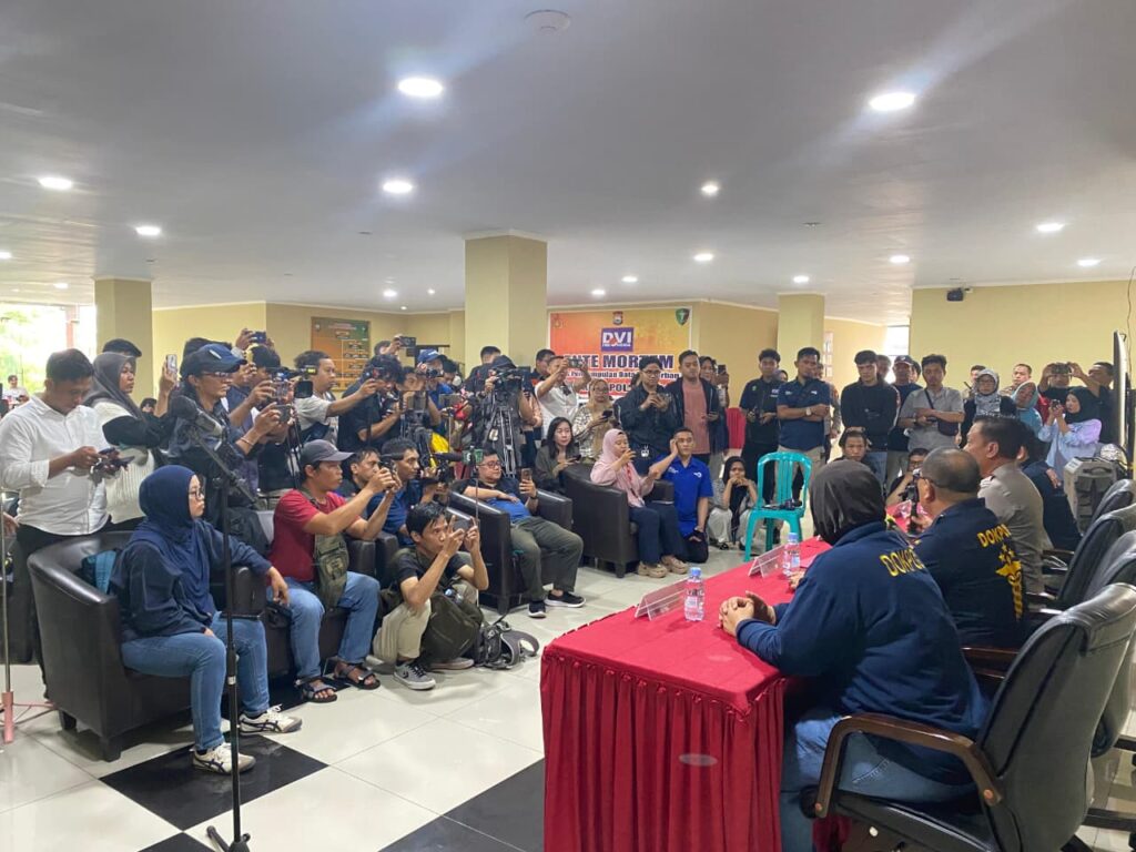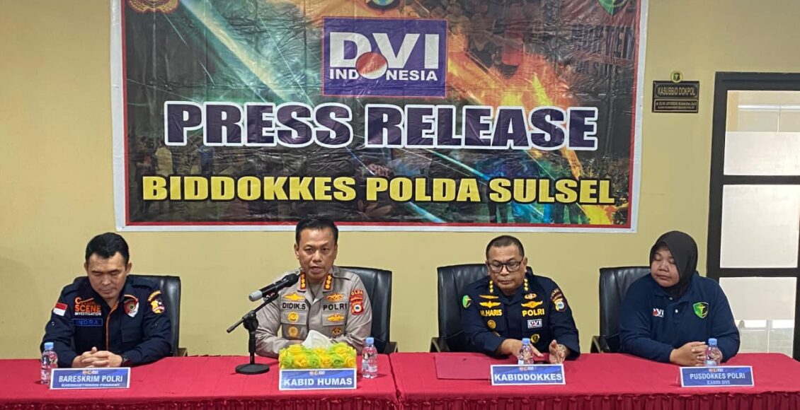 Press release dipimpin oleh Kabid Humas Polda Sulsel Kombes Pol. Didik Supranoto, S.I.K., M.H., bersama Kabiddokkes Polda Sulsel, perwakilan Pusdokkes Polri selaku Kabid DVI, serta Bareskrim Polri melalui Kabiddaktikkrim Pusident.