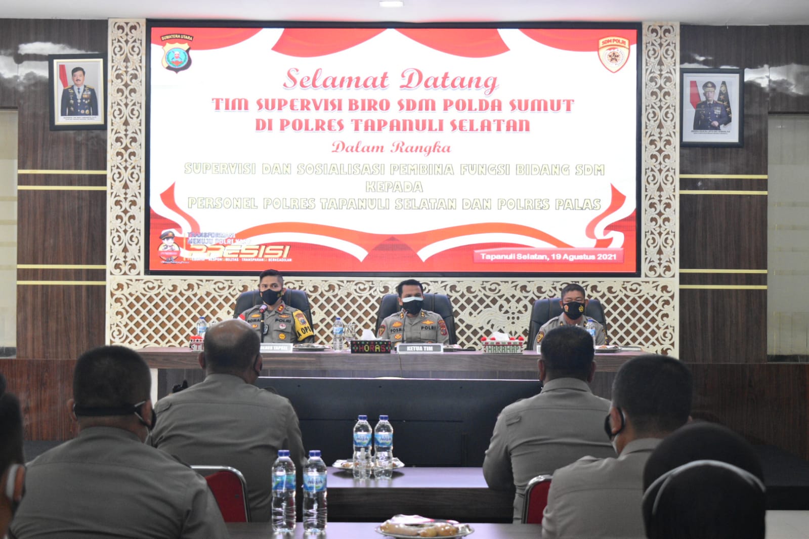Tapanuli Selatan,IKAGAWANEWS.ID – Biro SDM Polda Sumut yang di pimpin Ketua Timnya Kabag Dalpers Poldasu AKBP Hendry Posma Lubis, SIK, MH menggelar kegiatan Supervisi dan Sosialisasi Pembinaan Fungsi SDM untuk Polres Tapsel dan Polres Palas.Kegiatan ini berlangsung di Aula Pratidina Polres Tapsel, Kamis (19/8/2021) pukul 10.30 WIB.