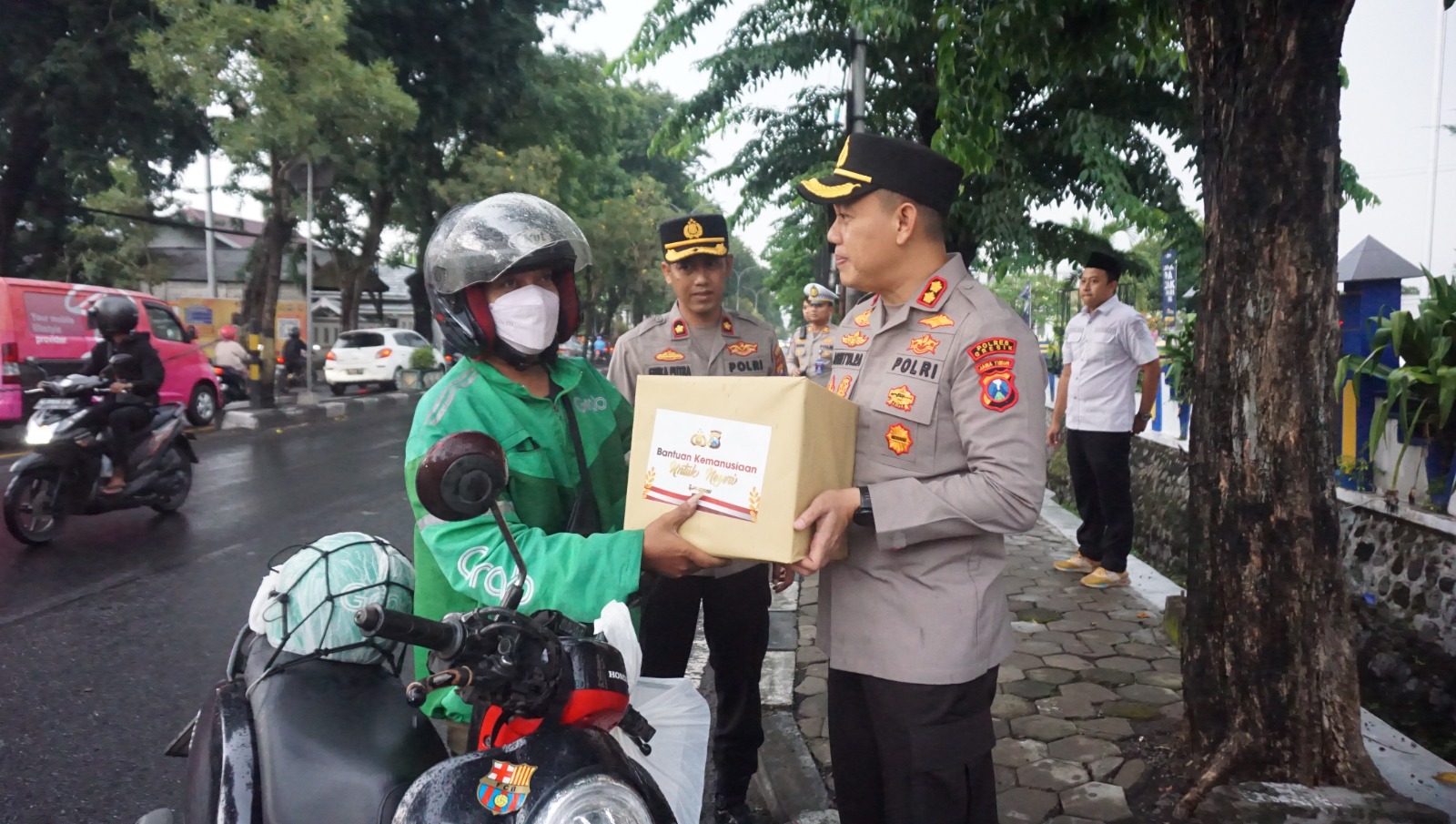 Kapolres AKBP Adhitya Panji Anom didampingi Wakapolres Gresik Kompol Erika Purwana Putra dan para pejabat utama Polres Gresik memberikan bantuan dengan mendatangi secara door to door disepanjang jalan Wahidin Sudirohusodo.