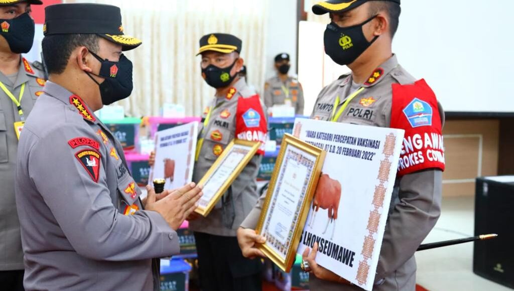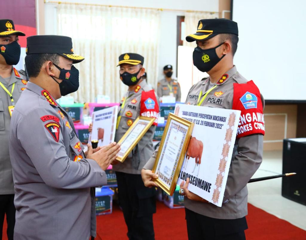 “Ini hadiah dari Kapolda Aceh kepada rekan-rekan yang pencapaian vaksinasinya berada diperingkat satu sampai tiga selama dua minggu terakhir dan peringkat satu sampai tiga selama progres vaksinasi serentak selama ini” ungkap Kapolri Jenderal Polisi Drs Listyo Sigit Prabowo MSi dalam sambutannya.