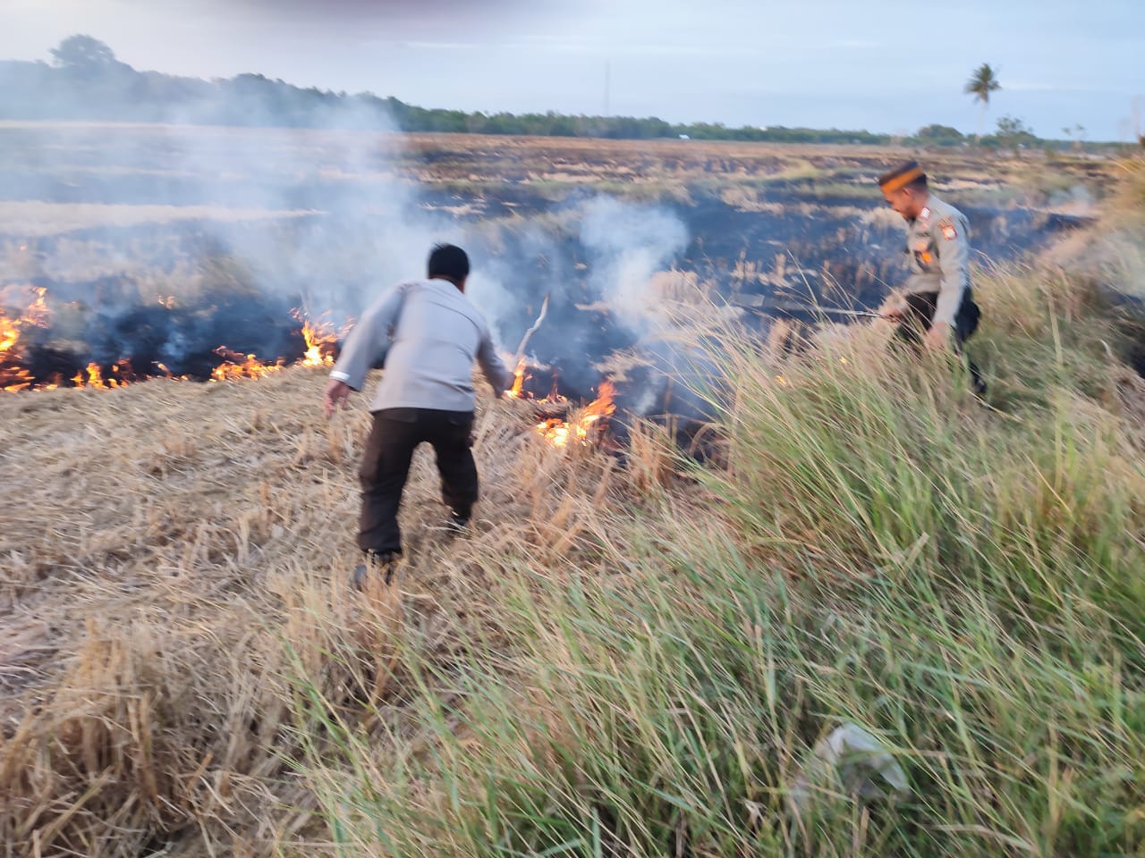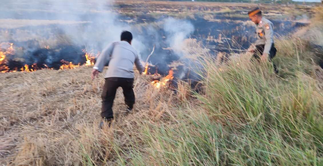 Dipimipin Aipda Mulyadi, personil Polsek Cenrana Polres Bone yang telah menemukan titik api yang berada di areal persawahan di Desa Labotto Kecamatan Cenrana Kabupaten Bone dan segera melakukan upaya pemadaman dengan menggunakan alat seadanya. Minggu (17/09/2023).