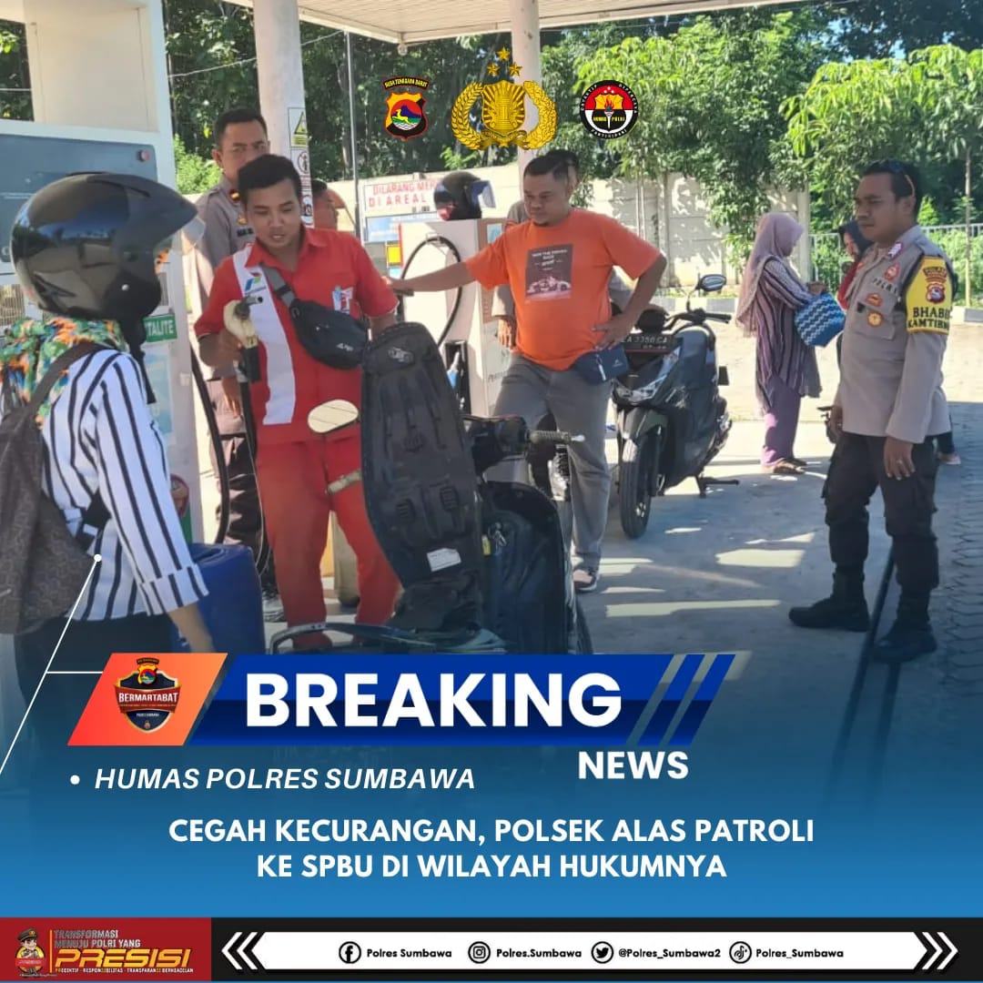Sumbawa Besar-NTB,ikagawanews.id – Antisipasi terjadinya kelangkaan Bahan Bakar Minyak (BBM) dan mengantisipasi adanya dugaan pencampuran BBM dengan air, Polsek Alas jajaran Polres Sumbawa lakukan patroli ke sejumlah SPBU di wilayah hukumnya, Sabtu (30/03/24) pagi.Kapolres Sumbawa AKBP Heru Muslimin S.I.K, M.I.P, melalui Kapolsek Alas AKP W.Sada Suitra SH., menyampaikan bahwa Polsek Alas melaksanakan patroli ke SPBU di wilayah hukum Polsek Alas dalam rangka menyikapi terkait telah terjadi tindak pidana dan praktik kecurangan yang terjadi di SPBU yang saat ini tersebar di beberapa wilayah Indonesia.