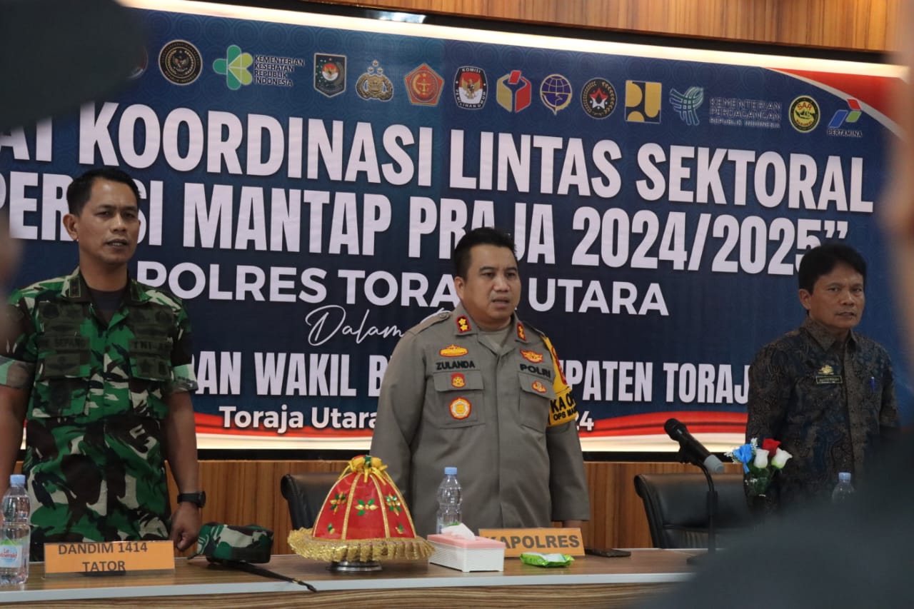 Rapat koordinasi yang digelar dipimpin oleh Kapolres Toraja Utara AKBP Zulanda, S.IK., M.Si, Dandim 1414/Tana Toraja Letkol Arm. Bani Kelana Sepang, dan Sekda Kabupaten Toraja Utara Salvius Pasang, S.P., M.P.