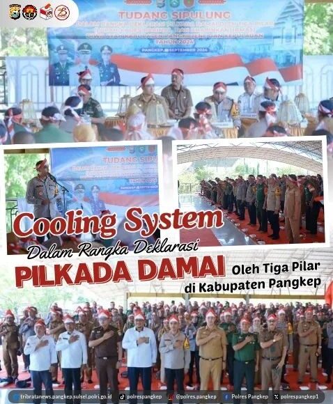 PANGKEP,ikagawanews.id – Polres Pangkep menggelar Cooling System Dalam rangka Deklarasi Damai bersama Tiga Pilar Kamtibmas (Lurah, Babinsa, dan Bhabinkamtibmas) di Tribun citramas Pangkep, Senin (09/09/2024). Acara ini bertujuan untuk menciptakan suasana aman dan kondusif selama Pilkada Serentak 2024. Kapolres Pangkep, AKBP Ari Kartika Bhakti,S.I.K., M.K.P., mengajak seluruh elemen untuk bersinergi menjaga keamanan dan ketertiban demi kesuksesan seluruh tahapan Pilkada.
