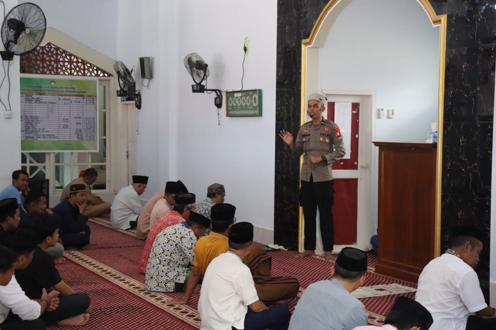 Anggota Satgas Preemtif OMB Polres Sinjai Ipda Agus Salim menyampaikan kepada jamaah sholat dhuhur tentang pentingnya partisipasi aktif masyarakat dalam menjaga keamanan menjelang Pemilu yang sudah dalam tahapan kampenye.