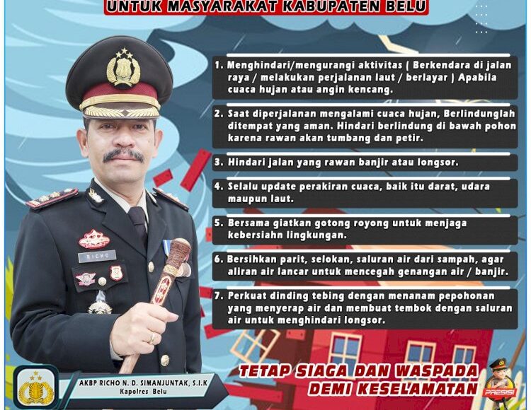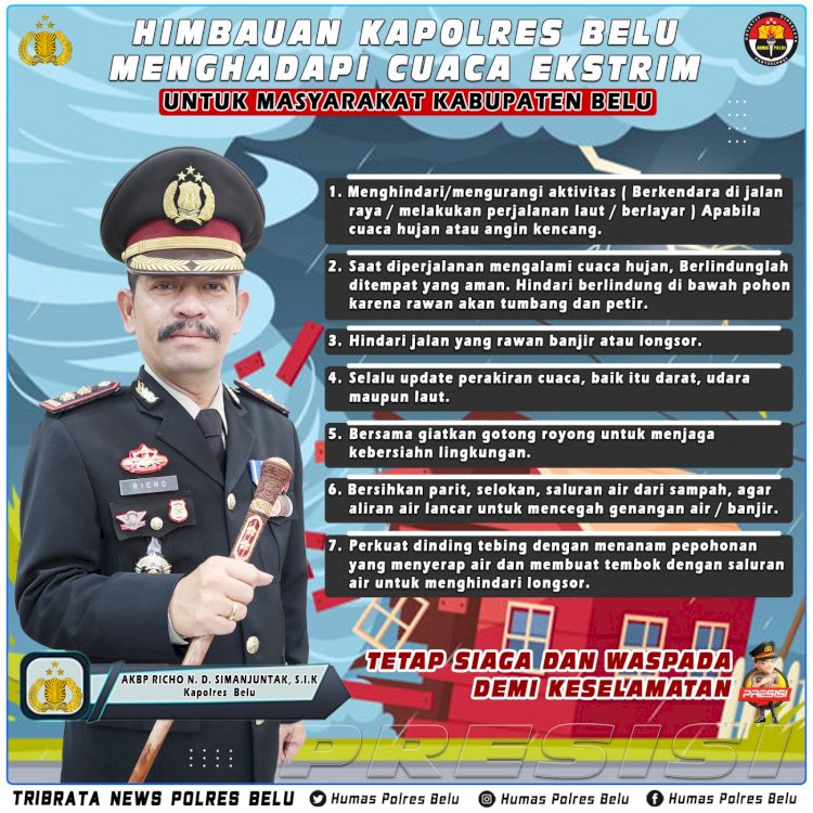 Untuk mengantisipasi potensi bencana alam yang bakal terjadi akibat cuaca yang ekstrim, Kapolres Belu, AKBP Richo Nataldo Devallas Simanjuntak, S.I.K mengeluarkan imbauan untuk masyarakat yang perlu dipedomani dan dilaksanakan terutama masyarakat yang sedang beraktivitas di luar rumah maupun yang tinggal di daerah angin kencang, rawan tanah longsor, banjir dan lainnya.