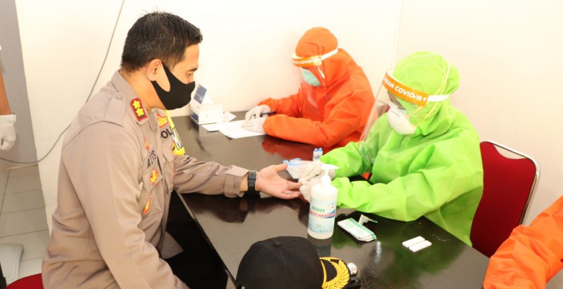 Kapolres Ponorogo setelah selesai melaksanaan rapit tes menyampaikan rapid test yang di laksanakan oleh Polres Ponorogo dalam rangka Hari Bhayangkara ke 74 tahun 2020 yang di lakukan oleh Urkes Polres Ponorogo yang di bantu tenaga medis dari Dinas Kesehatan Kabupaten Ponorogo sebagai pelaksana pengetesan yang hasil kesemuanya Non reaktif.