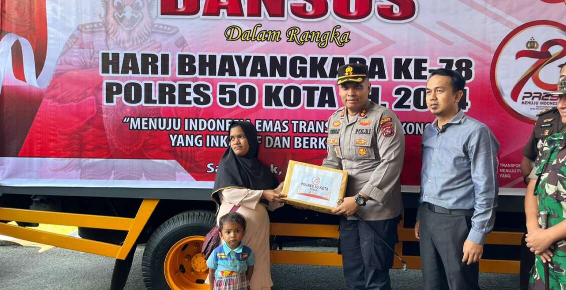 50 Kota, ikagawanews.id – Dalam rangka menyambut HUT Bhayangkara ke-78 yang jatuh pada 01 Juli 2024, Polres 50 Koya menyalurkan bantuan sosial (Bansos) berupa 350 paket Sembako bagi masyarakat Kabupaten Lima Puluh Kota.