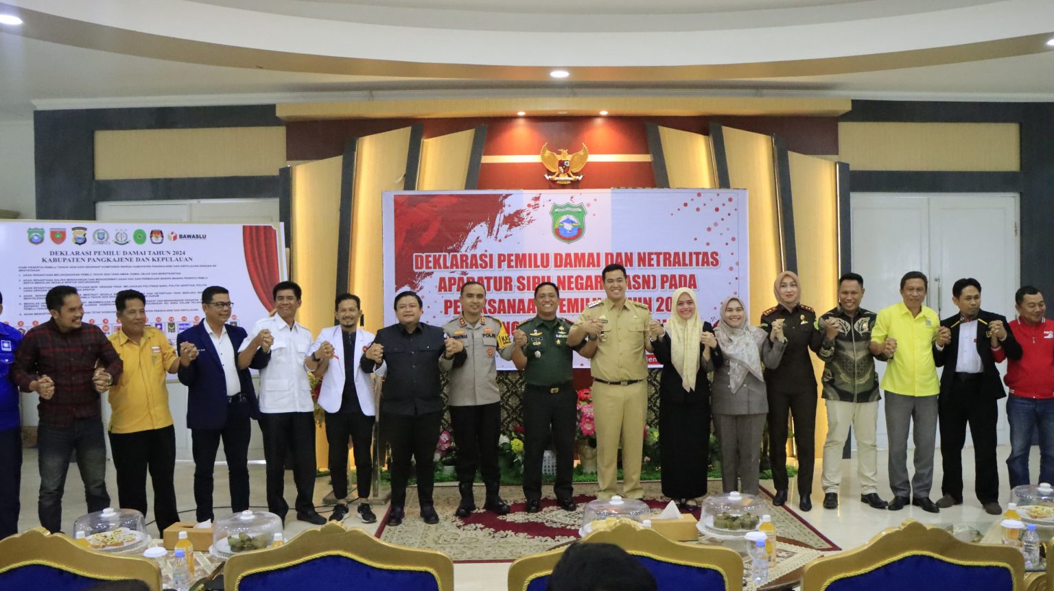Deklarasi Pemilu Damai di Rujab Bupati Pangkep turut dihadiri Bupati Kab. Pangkep H. Muhammad Yusran Lalogau, S.Pi, M.Si., Dandim 1421 Pangkep Letkol Inf. Fajar, Wakil Ketua I DPRD Kab. Pangkep Hj. Indriani., S.E., Kajari Kab. Pangkep Nurul Wahida Rival., S.H., M.H., Ketua Pengadilan Negeri Kab. Pangkep Galih Dewi Inanti Akhmad, S.H., Ketua KPU Kab. Pangkep Ichlas, S.H., Komisioner Bawaslu Kab Pangkep Koordiv Penanganan Pelanggaran dan Penyelesaian Sengketa (PP dan PS) Yulianto Ardiwinata, S. Sos., M. Si., Para staf ahli, asisten dan kepala perangkat daerah Kab. Pangkep, Para pimpinan UPTD Se Kab. Pangkep, Kabag Ops Polres Pangkep Akp. Nirwan, Para Kapolsek Jajaran Polres Pangkep, Para Danramil Jajaran Kodim 1421 Pangkep, Para Camat Kab. Pangkep, Para Kepala Desa/ Lurah Kab. Pangkep, Para ASN Pemda Kab. Pangkep dan Para pengurus Parpol Kab. Pangkep.(Red/Hum)