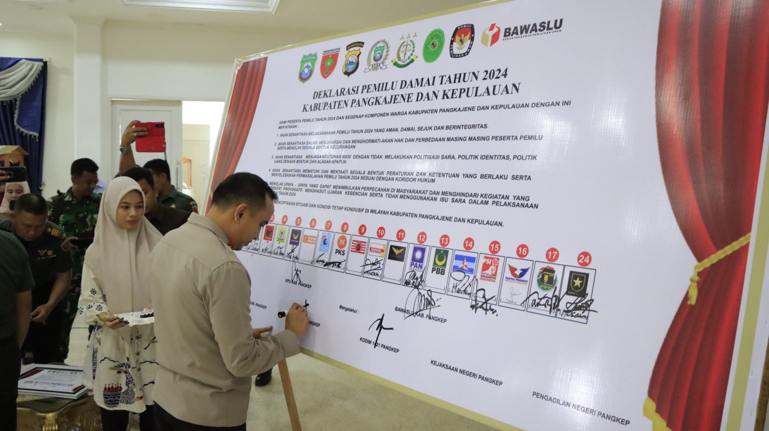 Deklarasi Pemilu Damai di Rujab Bupati Pangkep turut dihadiri Bupati Kab. Pangkep H. Muhammad Yusran Lalogau, S.Pi, M.Si., Dandim 1421 Pangkep Letkol Inf. Fajar, Wakil Ketua I DPRD Kab. Pangkep Hj. Indriani., S.E., Kajari Kab. Pangkep Nurul Wahida Rival., S.H., M.H., Ketua Pengadilan Negeri Kab. Pangkep Galih Dewi Inanti Akhmad, S.H., Ketua KPU Kab. Pangkep Ichlas, S.H., Komisioner Bawaslu Kab Pangkep Koordiv Penanganan Pelanggaran dan Penyelesaian Sengketa (PP dan PS) Yulianto Ardiwinata, S. Sos., M. Si., Para staf ahli, asisten dan kepala perangkat daerah Kab. Pangkep, Para pimpinan UPTD Se Kab. Pangkep, Kabag Ops Polres Pangkep Akp. Nirwan, Para Kapolsek Jajaran Polres Pangkep, Para Danramil Jajaran Kodim 1421 Pangkep, Para Camat Kab. Pangkep, Para Kepala Desa/ Lurah Kab. Pangkep, Para ASN Pemda Kab. Pangkep dan Para pengurus Parpol Kab. Pangkep.(Red/Hum)
