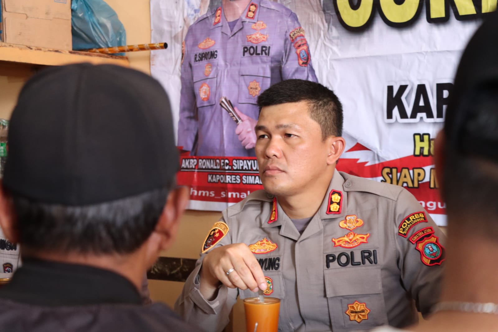Kunjungan yang pertama Kapolres Simalungun AKBP Ronald F.C Sipayung, S.H., S.I.K., M.H., mendengarkan curhatan warga di Warung Kopi Simanggoki, Pasar Pekan Raya Kecamatan Purba, Jalan Lintas Saribudolok dengan dilanjukan di Warung Kopi Pak Bonar Kelurahan Tiga Runggu Kabupaten Simalungun.