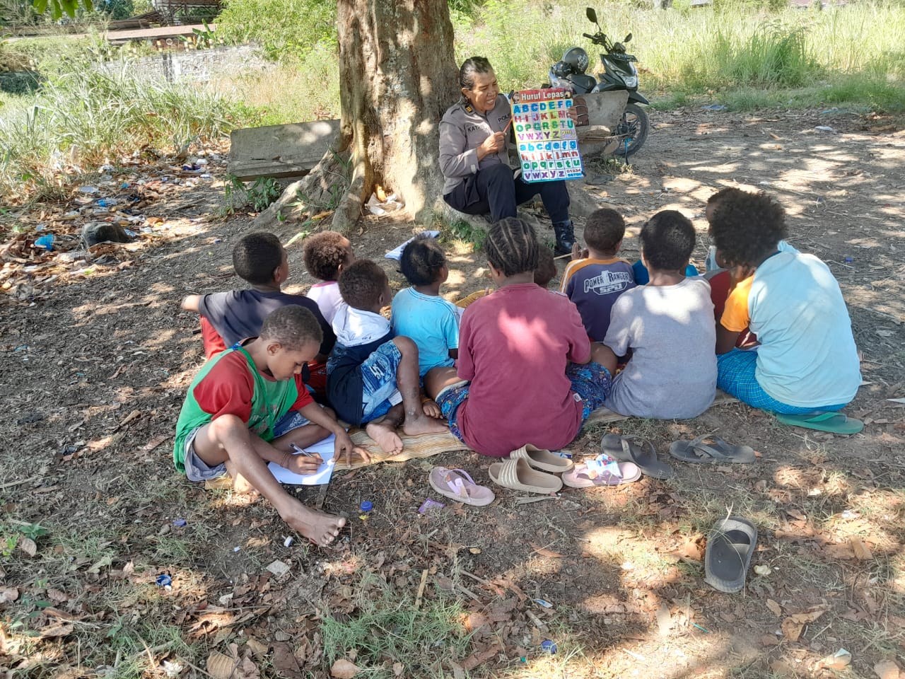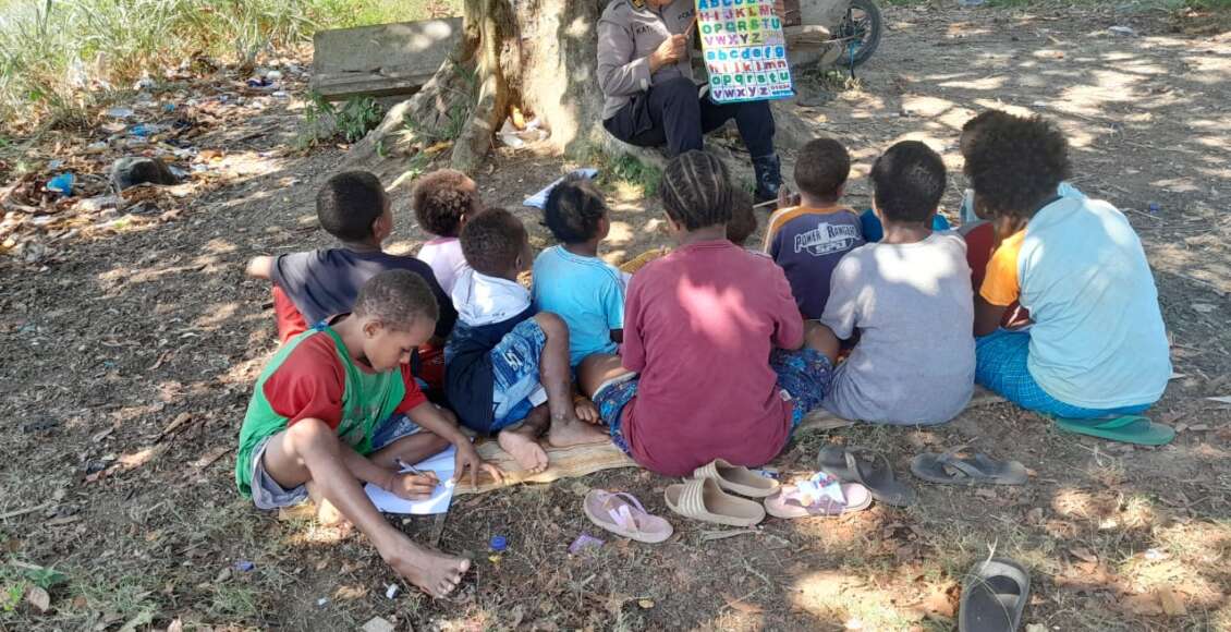 Dibawah Pohon Matoa, Polwan Polres Jayapura Ajarkan Anak – Anak Baca Tulis