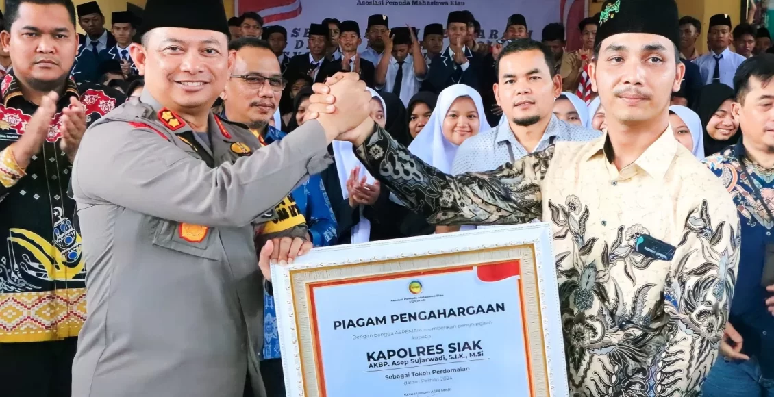 SIAK,ikagawanews.id  – Kapolres Siak, AKBP Asep Sujarwadi, S.I.K., M.S.I. mendapatkan apresiasi setinggi – tinggi nya dengan mendapatkan penghargaan dari ASPEMARI sebagai tokoh perdamaian dalam pemilu 2024 sewaktu dengan kegiatan seminar dan deklarasi dalam rangka Cooling System Pemilu Damai 2024 di Aula Putri Kacamayang, Kantor Camat Koto Gasib, Kamis (18/01/2024).