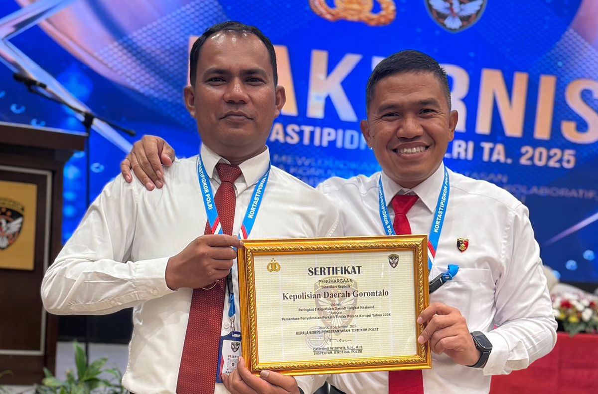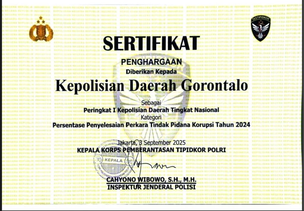 Dalam sertifikat penghargaan yang diterima, Polda Gorontalo dinilai menunjukkan komitmen kuat, konsistensi, serta kinerja optimal dalam menuntaskan berbagai kasus korupsi sepanjang tahun 2024- 2025. Capaian ini menjadi bukti nyata kesungguhan jajaran kepolisian Gorontalo dalam menghadirkan penegakan hukum yang transparan, profesional, dan berintegritas tinggi. Direktur Reserse Kriminal Khusus Kombes Pol. Dr. Maruly Pardede, S.H., S.I.K., M.H., mengungkapkan rasa syukurnya atas apresiasi nasional tersebut. Menurutnya, keberhasilan ini adalah buah kerja keras seluruh personel yang tak kenal lelah dalam mengawal penegakan hukum di daerah.