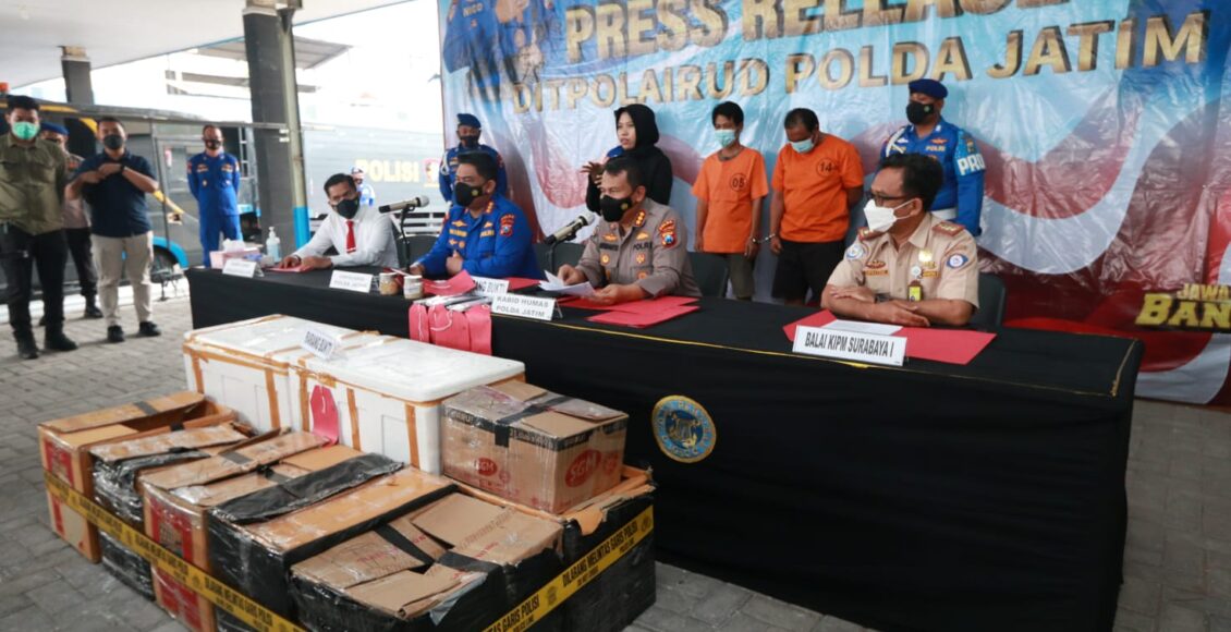SURABAYA,ikagawanews.id – Direktorat Polisi Air dan Udara (Ditpolairud) Polda Jawa Timur, didampingi Kabid Humas Polda Jatim Kombes Pol Dirmanto, merilis hasil ungkap penyelundupan benih lobster yang dilakukan oleh dua tersangka.