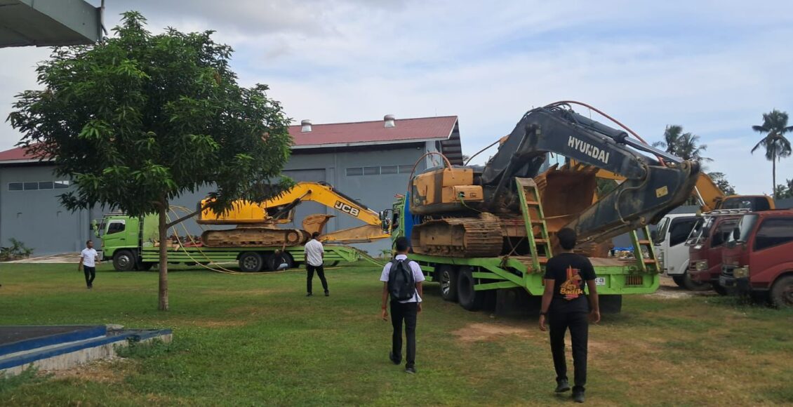 Adapun barang bukti yang turut diserahkan meliputi dua unit alat berat excavator, satu unit mesin dompeng, berbagai peralatan tambang seperti pipa, selang, dulang, terpal, dan karung berisi material tambang, serta dokumen pendukung hasil pemeriksaan ahli.