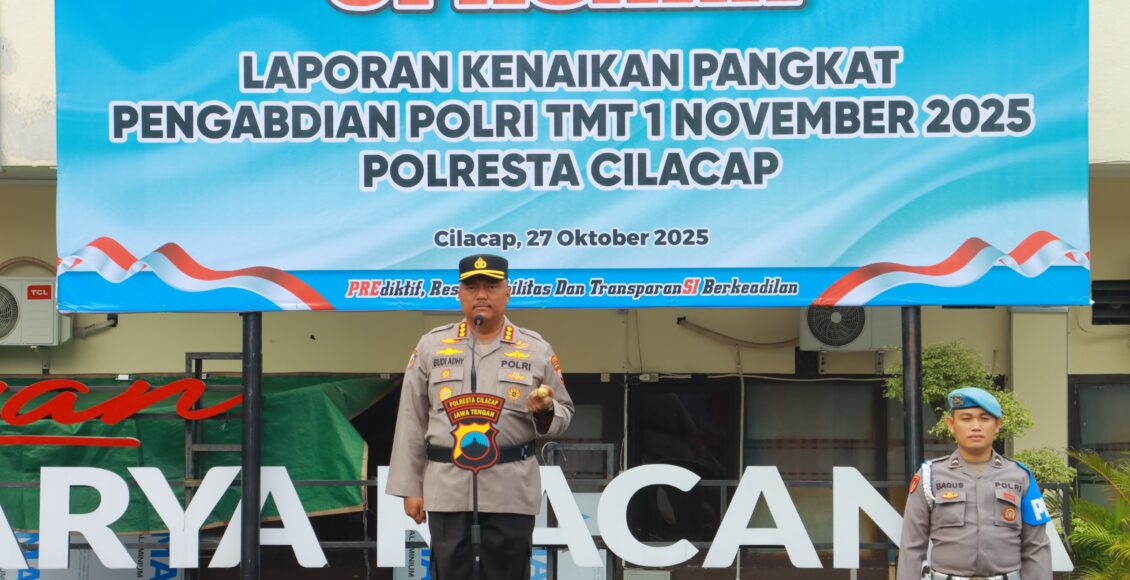 CILACAP,ikagawanews.id – Polresta Cilacap menggelar Upacara Kenaikan Pangkat pengabdian kepada Dua Bhayangkara Polresta yang berlangsung pada Senin pagi (27/10/2025). Upacara dipimpin langsung Kapolresta Cilacap Kombes Pol Dr. Budi Adhy Buono, S.H., S.I.K., M.H.
