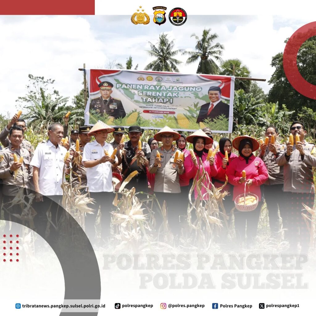 PANGKEP,ikagawanews.id  – Polres Pangkep bersama instansi terkait melaksanakan Panen Raya Jagung Serentak Tahap I dalam rangka mendukung program swasembada pangan tahun 2025. Kegiatan ini berlangsung pada Rabu, 26 Februari 2025, pukul 10.00 WITA, bertempat di Kampung Allakarajae, Desa Padang Lampe, Kecamatan Ma’rang, Kabupaten Pangkep.