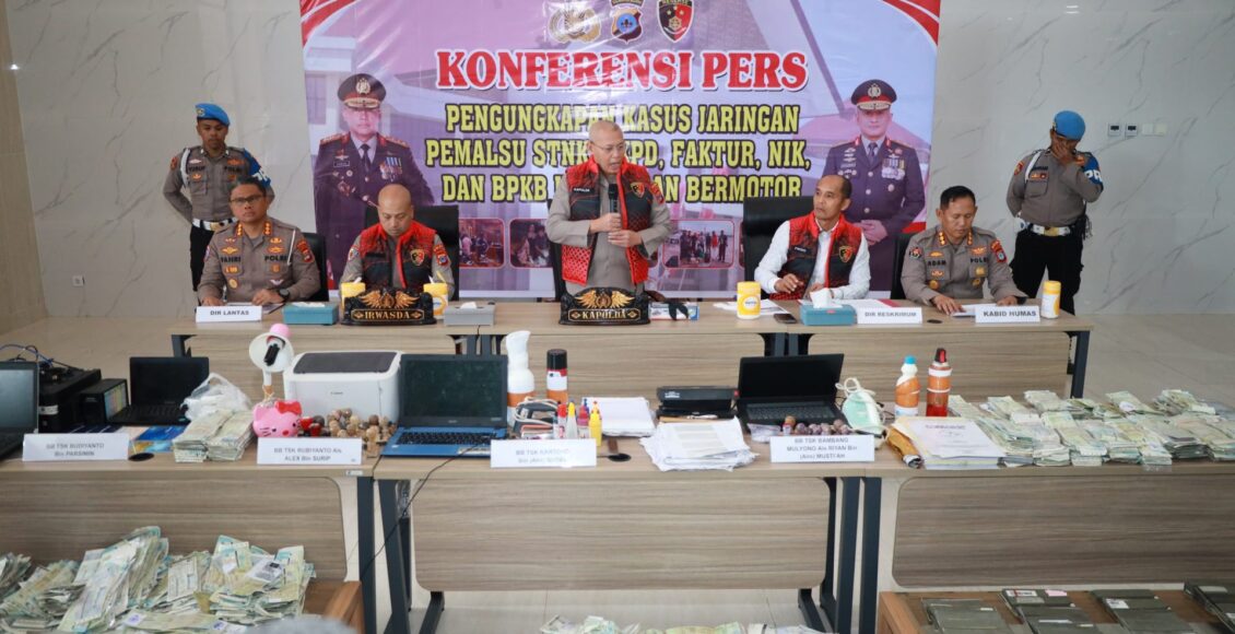 KALSEL,ikagawanews.id – Direktorat Reserse Kriminal Umum (Ditreskrimum) Polda Kalimantan Selatan menggelar konferensi pers terkait pengungkapan kasus jaringan pemalsuan dokumen kendaraan bermotor, Kamis (19/2/2026) pagi. Konferensi pers yang berlangsung di Lobby Mapolda Kalsel, Banjarbaru ini dipimpin langsung oleh Kapolda Kalsel didampingi Irwasda, Dir Reskrimum, Dir Lantas, dan Kabid Humas Polda Kalsel.