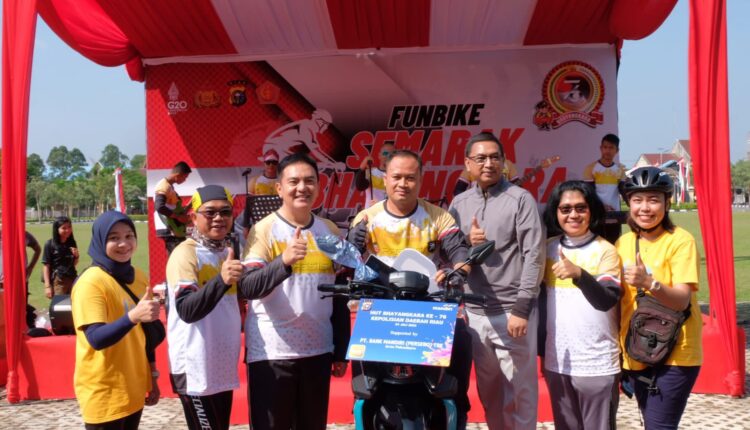 PEKANBARU,Harnasnews – Kepolisian Daerah (Polda) Riau menggelar Fun Bike Semarak Bhayangkara, yang merupakan rangkaian jelang perayaan puncak Hari Bhayangkara ke 76 nanti. Acara digelar di halaman Mapolda Riau Jalan Pattimura, Minggu (19/6/2022) pagi. Dalam kegiatan itu, peserta dari unsur Kepolisian, TNI, pemerintahan dan masyarakat gowes (Komunitas sepeda) dengan rute dalam Kota Pekanbaru sejauh 10 kilometer.