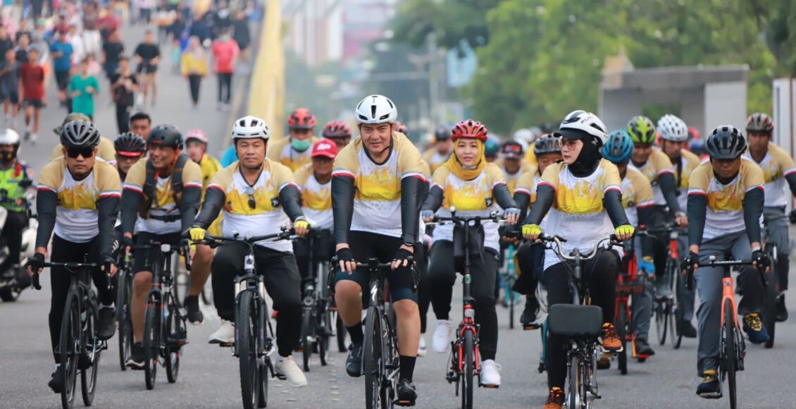PEKANBARU,Harnasnews – Kepolisian Daerah (Polda) Riau menggelar Fun Bike Semarak Bhayangkara, yang merupakan rangkaian jelang perayaan puncak Hari Bhayangkara ke 76 nanti. Acara digelar di halaman Mapolda Riau Jalan Pattimura, Minggu (19/6/2022) pagi. Dalam kegiatan itu, peserta dari unsur Kepolisian, TNI, pemerintahan dan masyarakat gowes (Komunitas sepeda) dengan rute dalam Kota Pekanbaru sejauh 10 kilometer.
