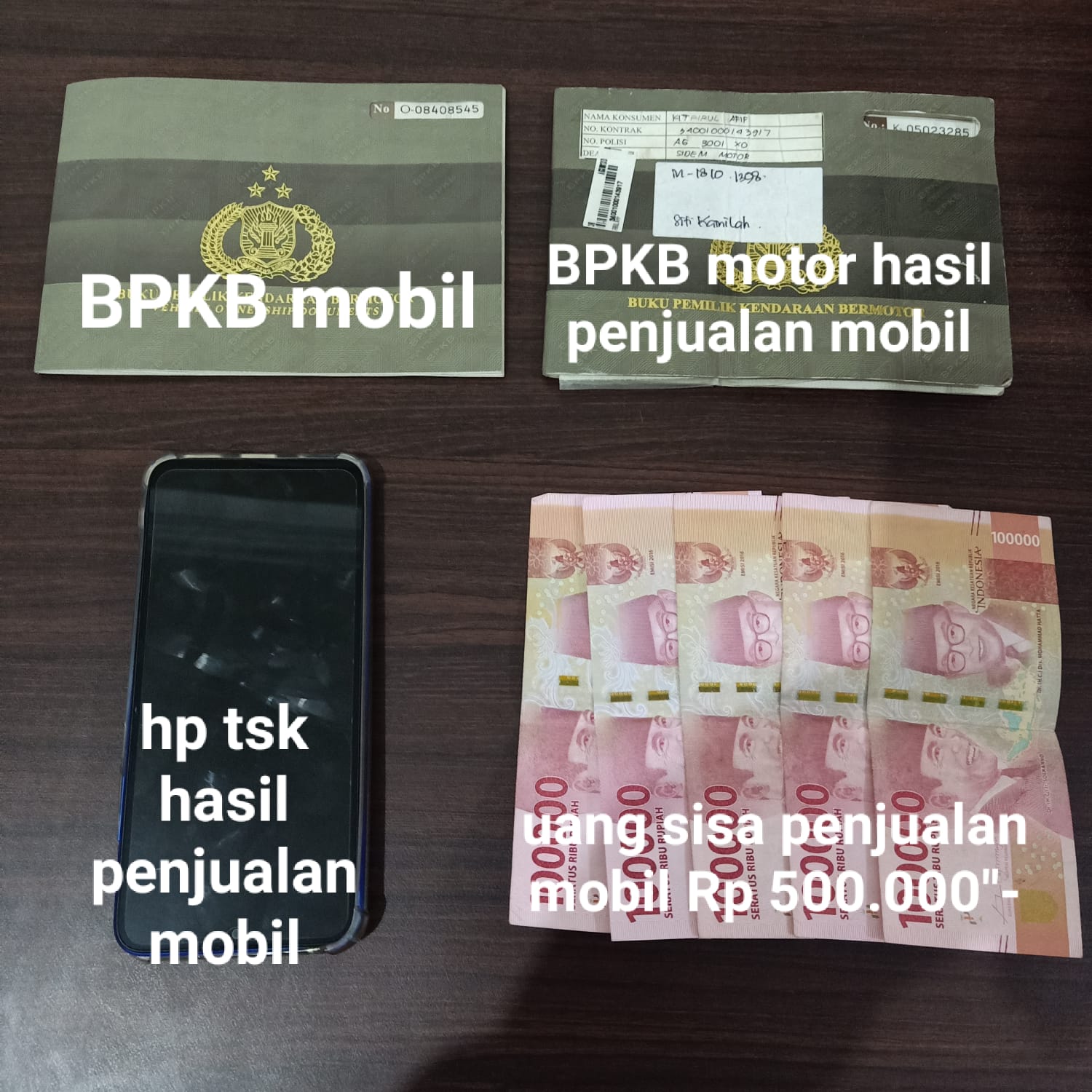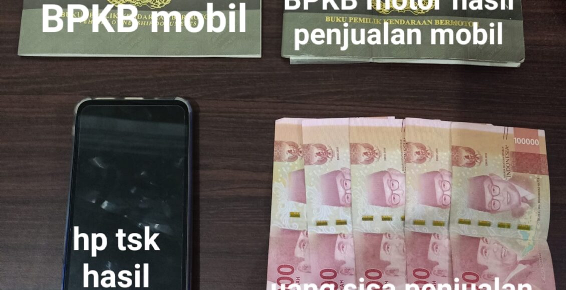 Selain mengamankan pelaku Chabib yang sudah ditetapkan sebagai tersangka, petugas juga mengamankan barang bukti berupa, 1 buku BPKB mobil toyota avanza warna hitam nopol S 1553 OH atas nama Moh Rifai, 1 unit sepeda motor suzuki satria warna biru nopol AG 3001 XO beserta kelengkapan suratnya, 1 unit HP, uang tunai Rp 500 Ribu sisa uang penjualan dan 1 unit sepeda motor serta HP yang dibeli dengan menggunakan uang hasil penjualan mobil.