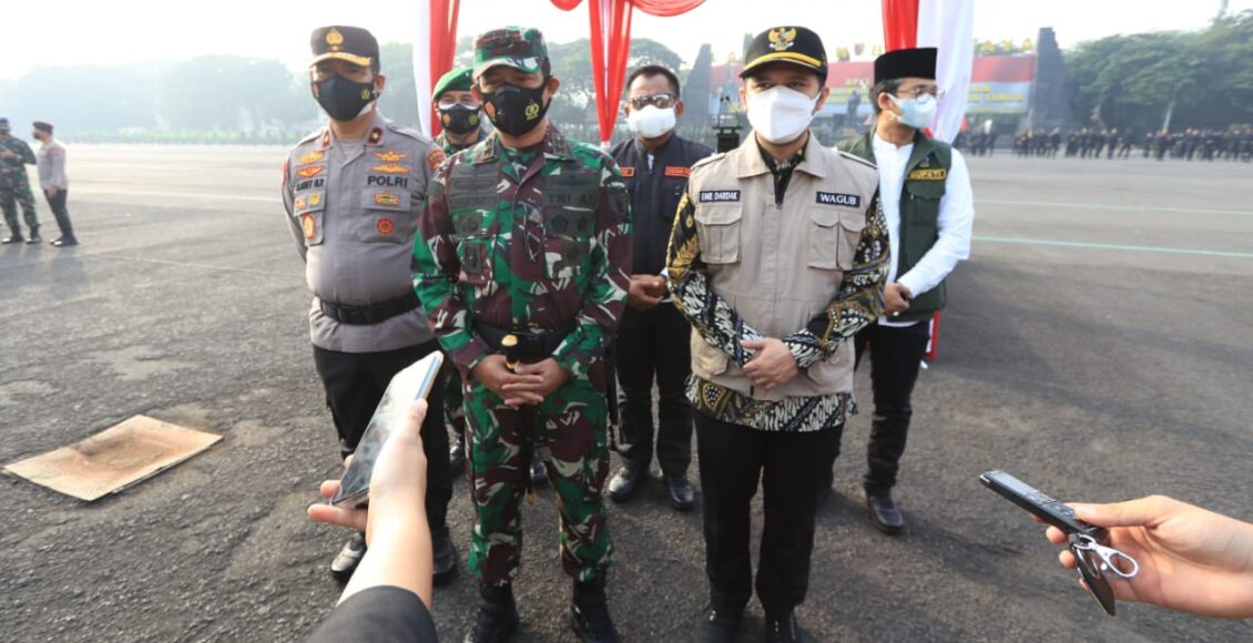 SURABAYA,IKAGAWANEWS.ID – Forkopimda Jawa Timur, Wakil Gubernur Emil Elistianto Dardak, Pangdam V Brawijaya Mayjen TNI Suharyanto, Wakapolda Jatim Brigjen Pol. Drs. Slamet Hadi Supraptoyo gelar apel pasukan dalam rangka pelaksanaan PPKM Darurat di wilayah Jawa Timur, yang dilaksanakan di lapangan, Mahkodam V Brawijaya, Jumat (2/7/2021) pagi.